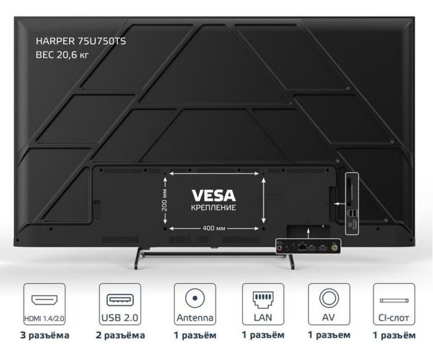 Диагональ экрана 75 Разрешение 3840х2160 Разрешение HDTV 4K UHD Функция HDR да Формат экрана 16: 9, 4: 3, Авто Тип подсветки экрана Direct Углы обзора 178 Тип панели ADS Частота обновления экрана 60 Гц Время отклика пикселя 8 мс. Яркость 330 Кд/м2 Контрастность 220000: 1 Количество цветов 1 млрд. Цветовой фильтр RGB Тюнер телевизора Цифровые тюнеры DVB-T, DVB-T2, DVB-C Поддержка PAL да Поддержка SECAM да Поддержка NTSC да Прием звука да Поддержка Smart TV да Яндекс ТВ да Голосовой помощник Алиса Операционная система Android 9.0 Поддержка клавиатуры и мыши да Процессор ARM Cortex-A53 Видеопроцессор ARM Mali-G52 MC1 Frameless Dolby, Bluetooth AOSP 9.0; 1,5Gb RAM + 8Gb ROM Цвет черный Вес 29 кг. Вес с подставкой 29.5 кг. Вес с упаковкой 43.5 кг. Размеры без подставки (ШхВхГ) 1667x956.8x80.7 мм. Размеры с упаковкой (ШхВхГ) 1870x1080x164 мм.