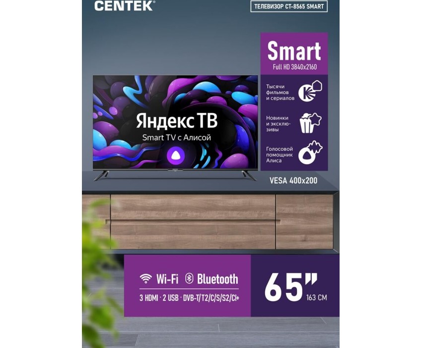 65 LED телевизор Centek CT-8565 SMART, 4K UltraHD, Wi-Fi, Bluetooth, HDMIx3, USBx2, DVB-T2 Яндекс ТВ