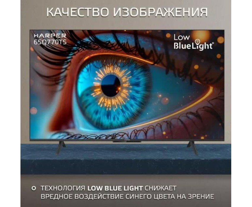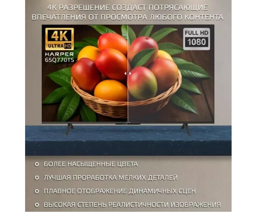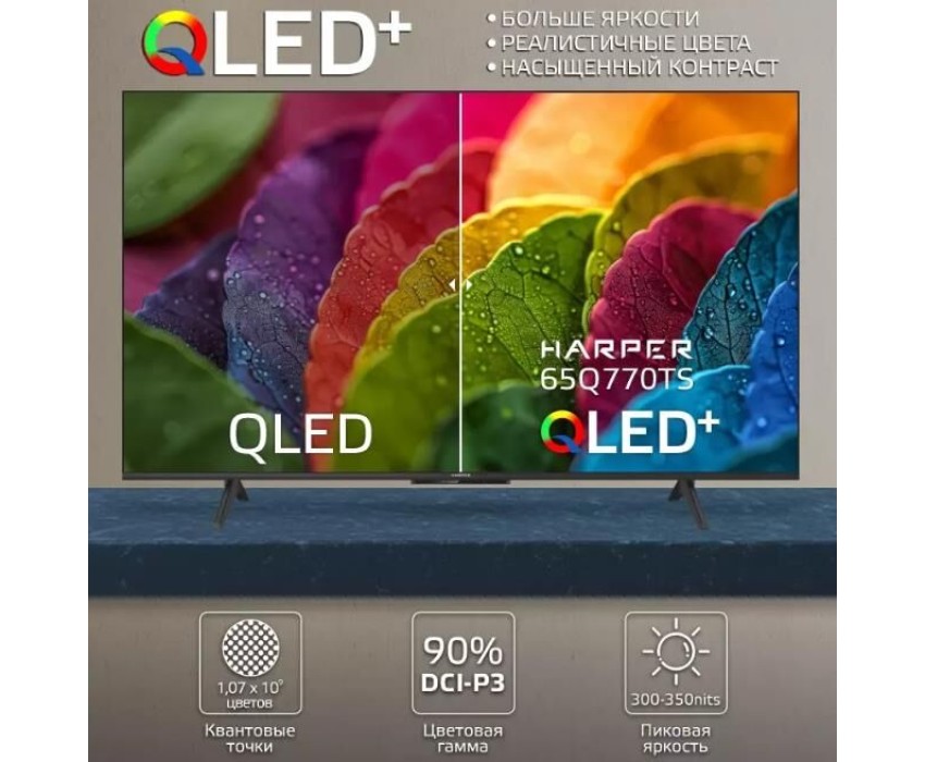 Диагональ экрана 65" (164 см); 4K QLED; Разрешение экрана 3840х2160; Смарт: Official Google Аndroid TV, Память: 2GB-RAM/16GB-ROM; Частота кадров 60-120 Гц, Dolby audio, Dolby Atmos, Аудио: 30(2х15)Вт, Голосовой помощник, Функция поиска пульта, Цифровой тюнер DVB-T/T2/C/S2; Bluetooth 5.1, Wi-Fi 2.4/5 ГГц, Безрамочный дизайн, Матовый экран без бликов и отражений, Декодеры стереозвука NICAM, А2, АСЗ; Формат изображения: 16:9; Динамический контраст 1400:1; Яркость 350 кд/м2; Угол обзора (гор/верт) 178°/178°; Цифровой 3D фильтр; Количество цветов 1 млрд.; Время отклика 8 мс; Меню на русском, английском языках; Телетекст; Входы/выходы: Антенный вход, Вход для спутниковой антенны, Композитный видео/аудио вход, 3х HDMI (1.4/2.0), 2 х USB (2.0), S/PDIF (Оптический), LAN, CI слот. Размеры с подставкой: 1445х913х301 мм; Размеры без подставки: 1445х838х91,5 мм ; Вес: 14,1кг; VESA: 400х200; Габариты в упаковке: 1620x965x155 мм; Вес в упаковке: 23,8кг