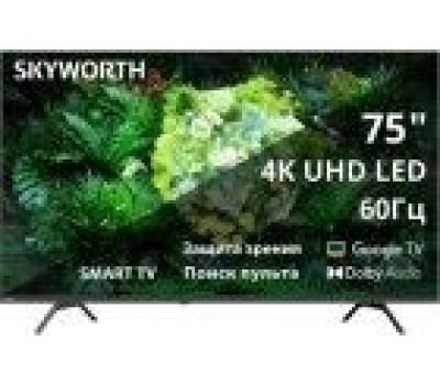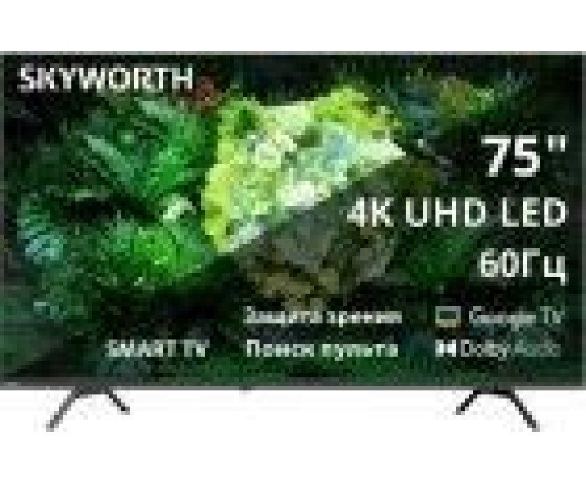 Инновации с заботой о вашем комфорте. Телевизор SKYWORTH G66G — это современный 4K UHD телевизор с поддержкой Google TV, который сочетает передовые технологии визуализации, интеллектуальные функции и эргономичный дизайн. Ключевые преимущества: Забота о зрении Eye Care: Автоматическая регулировка яркости и цветовой температуры с помощью датчика освещения. Технологии Flicker Free (без мерцания) и Low Blue Light (снижение вредного синего света) сертифицированы TÜV Rheinland. Превосходное изображение и звук: Разрешение 4K HDR 10 для высокой детализации и контрастности. Технология Dolby Audio создает кинематографическое звучание, погружая в атмосферу фильмов и сериалов. Умная платформа Google TV: Доступ к тысячам приложений, фильмам, сериалам и музыкальным сервисам. Управление с помощью голоса через Google Assistant (доступно по кнопке на пульте или команде "Ok, Google"). Практичные функции: Встроенная функция поиска пульта ДУ (Find-my-remote), автоматическое управление громкостью, родительский контроль и настройка времени просмотра. Элегантный дизайн: Ультратонкий корпус, безрамочный экран Infinity Screen 4.0 для максимального погружения и стильная подставка. Панель с индикацией режимов работы добавляет технологичности. Телевизор SKYWORTH G66G — это выбор в пользу качества, комфорта и современных технологий. Общие данные: Диагональ: 75" Разрешение: 3840 x 2160 Изображение: Уровень контраста: 1400:1 Яркость: 300 nit Цветовая гамма: 68 Глубина цвета: 10 bit Угол обзора: 178°…
