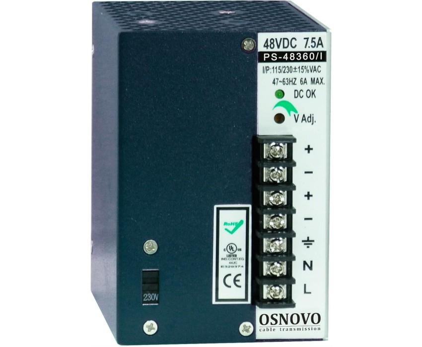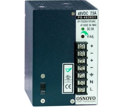 Ширина товара: 121 мм Высота товара: 75 мм Модель: PS-48360/I Глубина товара: 110 мм Описание: Промышленный блок питания. DC48V, 7,5A (360W). Диапазон входных напряжений: AC195-265V. КПД: 83%. Регулировка выходного напряжения в диапазоне 44-53V. Защита от короткого замыкания, перенапряжения и перегрузки. Принудительная система охлаждения (вентилятор). Монтаж на DIN-рейку или стену. Бренд: OSNOVO PartNumber/Артикул Производителя: PS-48360/I Габариты упаковки (ед) ДхШхВ: 0.1x0.1x0.1 м Вес упаковки (ед): 0.1 кг Объем упаковки (ед): 0.001 м3 Тип: Блок питания AC/DC