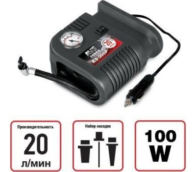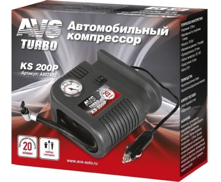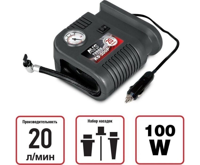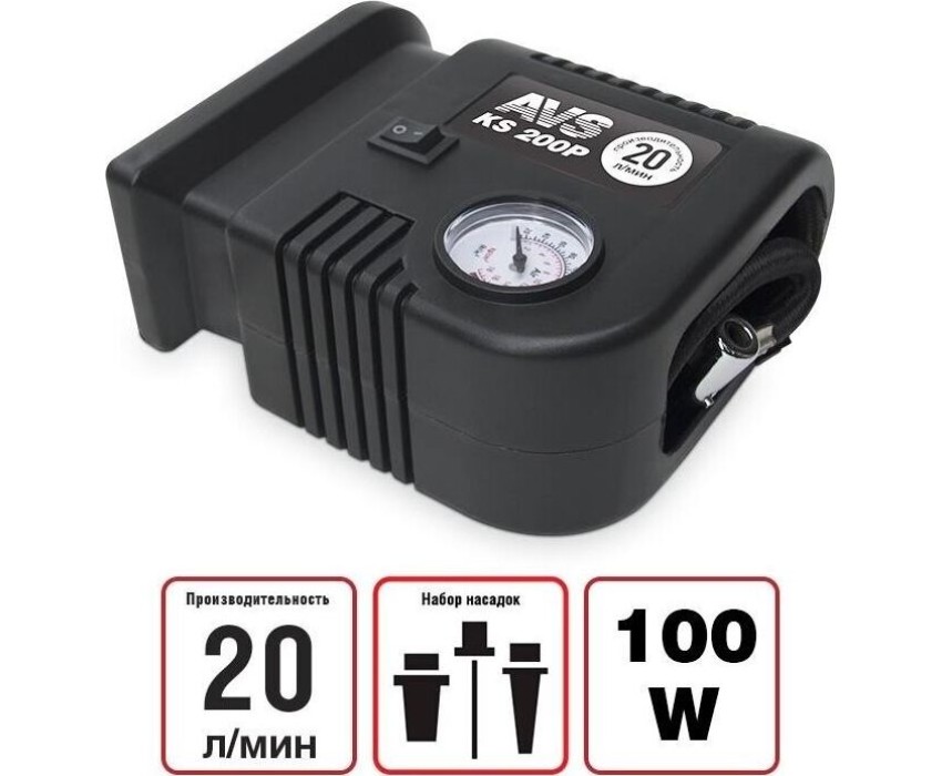 Автомобильный компрессор AVS "KS200P" предназначен для накачки воздухом шин легковых и коммерческих автомобилей. Рабочее напряжение компрессора - 12В. Высокая производительность делает возможным более широкое применение. Автомобильный компрессор может быть использован для накачки мячей, матрасов, проведения покрасочных работ. Максимальный ток потребления: 14 А Напряжение: 12 В Мощность: 100 W Максимальное давление: 7 Атм. Производительность: 20 л/мин. Рабочая температура: от -35°С до +80°С Длина кабеля: 3 м Масса: 0.87 кг Комплектация: • Компрессор • Набор насадок