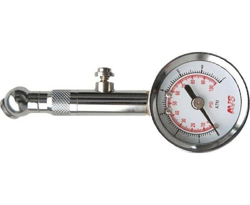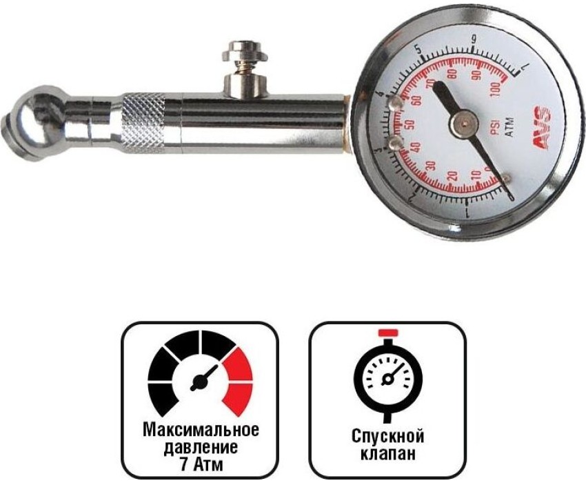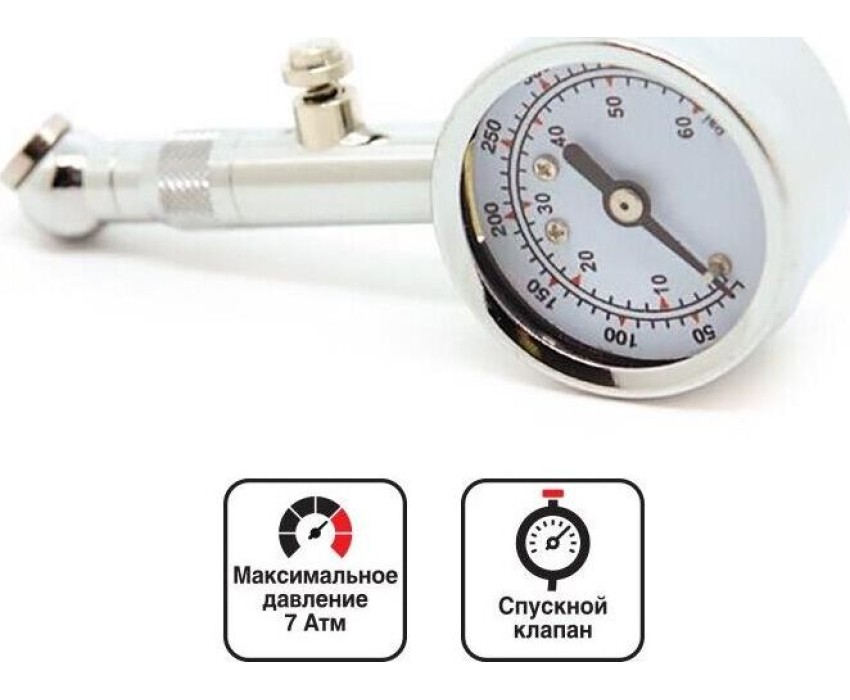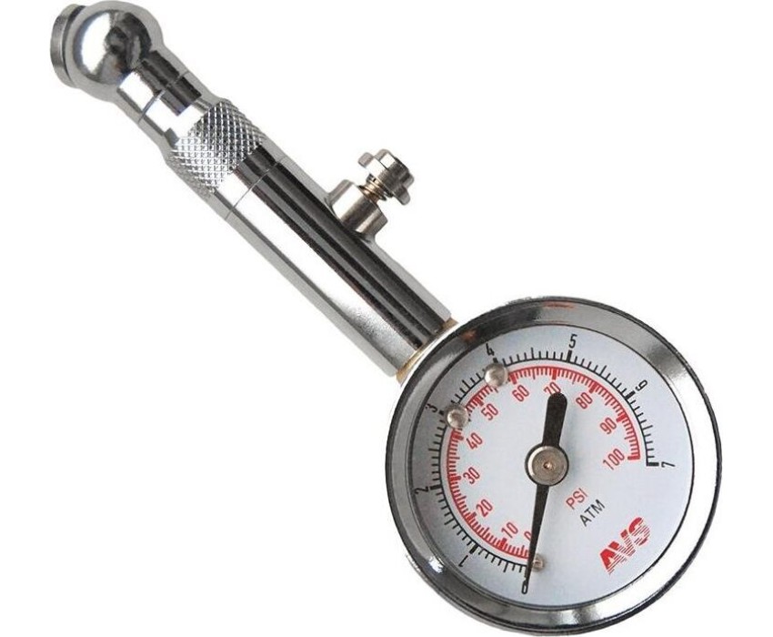 Аналоговый манометр, с помощью которого, без затруднений, любой автолюбитель сможет измерить давление в шинах. Необходимость такого аксессуара знает каждый автомобилист, хоть раз столкнувшийся с повреждением покрышки или ухудшением управляемости из-за приспущенных колес. • Две шкалы измерения давления (атм (bar) -> psi) • Диапазон измерений: 2,00-100,00 PSI (фунт/кв. дюйм); 0,15-7,00 BAR (атм) • Погрешность прибора: ± 0,05 BAR • Спускной клапан