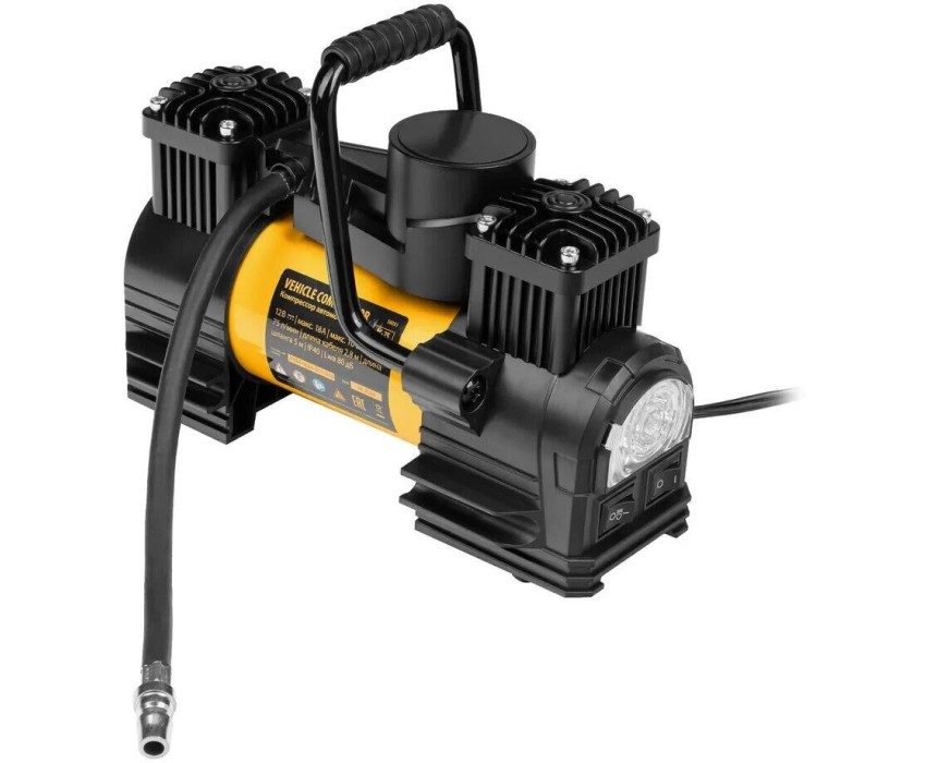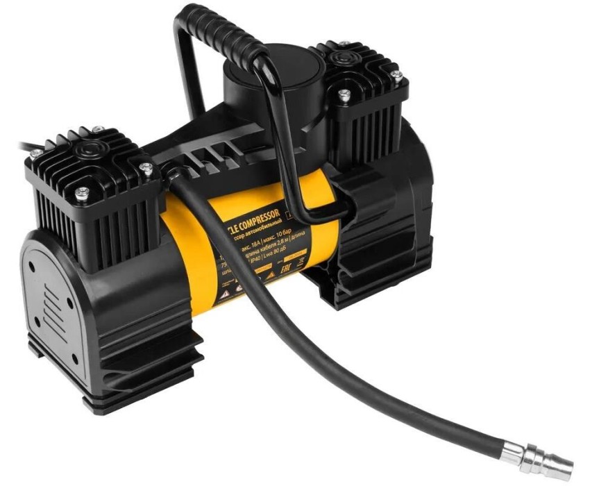 Автомобильный двухпоршневой компрессор Denzel AC-75 58051 производительностью 75 л/мин, с LED-фонарем, работает от сети 12 В, поддерживает давление 10 атм. и предназначен для быстрой и эффективной накачки шин, резиновых матрацев и других надувных предметов. Для этого в комплект поставки входит 3 насадки. Компрессор подключается к автомобильному аккумулятору при помощи клемм. Благодаря двухпоршневой конструкции отличается высокой производительностью — накачка шины R16 занимает не более 3-4 минут. Станет незаменимым помощником в поездке и на отдыхе.