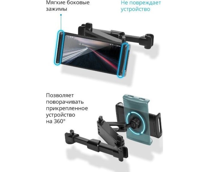 Способ фиксации мобильного устройства: Зажим, Регулируемое расстояние между зажимами: 120–200 мм, Максимальное расстояние между зажимами: 120 мм, Минимальное расстояние между зажимами: 200 мм, Минимально допустимое расстояние между стойками подголовника: 105 мм, Максимально допустимое расстояние между стойками подголовника: 145 мм, Длина штанги: 200 мм, Угол поворота: 360 °, Назначение: Для смартфонов/планшетов.