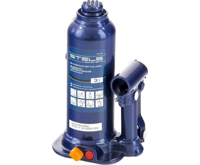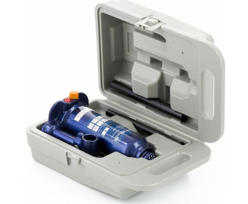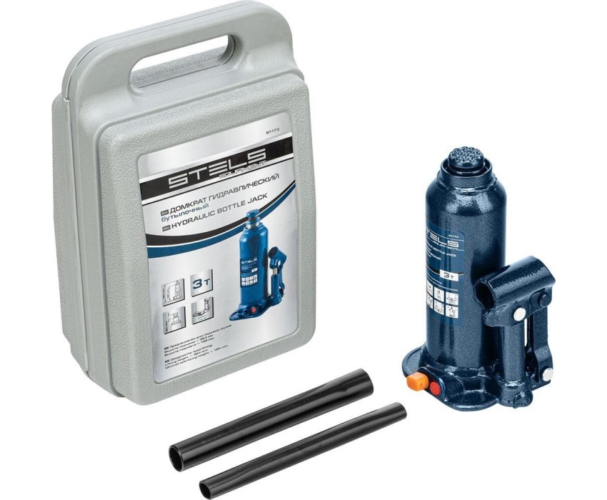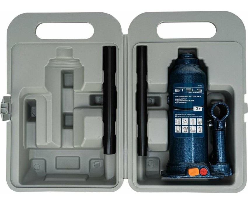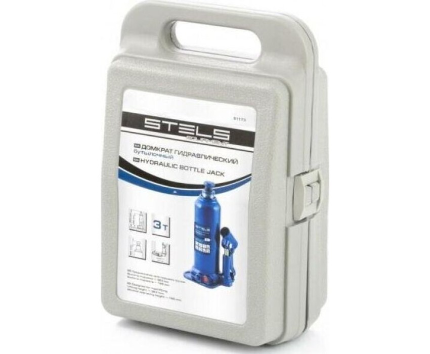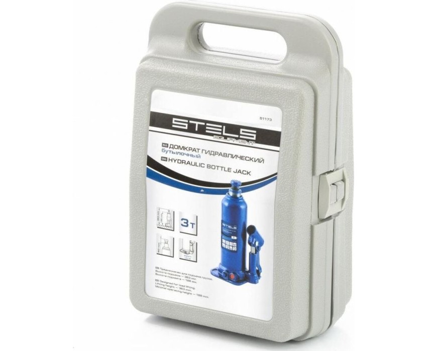 Гидравлический бутылочный домкрат Stels 51173 в пластиковом кейсе предназначен для поднятия грузов весом до 3 т на высоту 188-363 мм. Он не занимает много места и легко помещается в багажник, поэтому его можно брать с собой в дорогу или хранить в гараже. Используется для самостоятельного ремонта авто, также подходит для профессионального применения на станциях технического обслуживания.ПреимуществаЗащита от перегрузки и поломки — встроенный клапан безопасности не допускает подъема груза тяжелее 3000 кг.Надежная и долговечная конструкция — корпус из коррозионностойкой стали приварен к станине.Удобное хранение и транспортировка — домкрат поставляется в пластиковом кейсе.