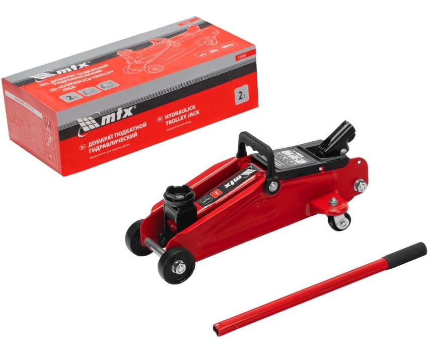 Гидравлический подкатной домкрат MTX 51080 с высотой подхвата 140 мм предназначен для подъема грузов массой до 2 т на высоту до 340 мм. Применяется для обслуживания автомобилей со стандартным клиренсом. Компактный домкрат подходит для самостоятельного использования автовладельцами. Преимущества Надежность — усиленная конструкция выдерживает значительные нагрузки без риска поломки. Безопасность — клапан сброса избыточного давления защищает домкрат от перегрузки, предотвращая подъем груза массой более 2 т. Маневренность — благодаря поворотным колесам подъемное устройство можно быстро подвести под груз. Небольшие габариты 450 х 210 х 150 мм — домкрат можно разместить в багажнике автомобиля.