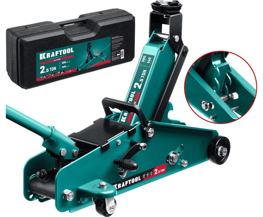 KRAFTOOL S-PIN, в кейсе 2.5 т, 140 - 385 мм, с увеличенным подъемом и фиксатором, подкатной домкрат (43457-2.5-K)