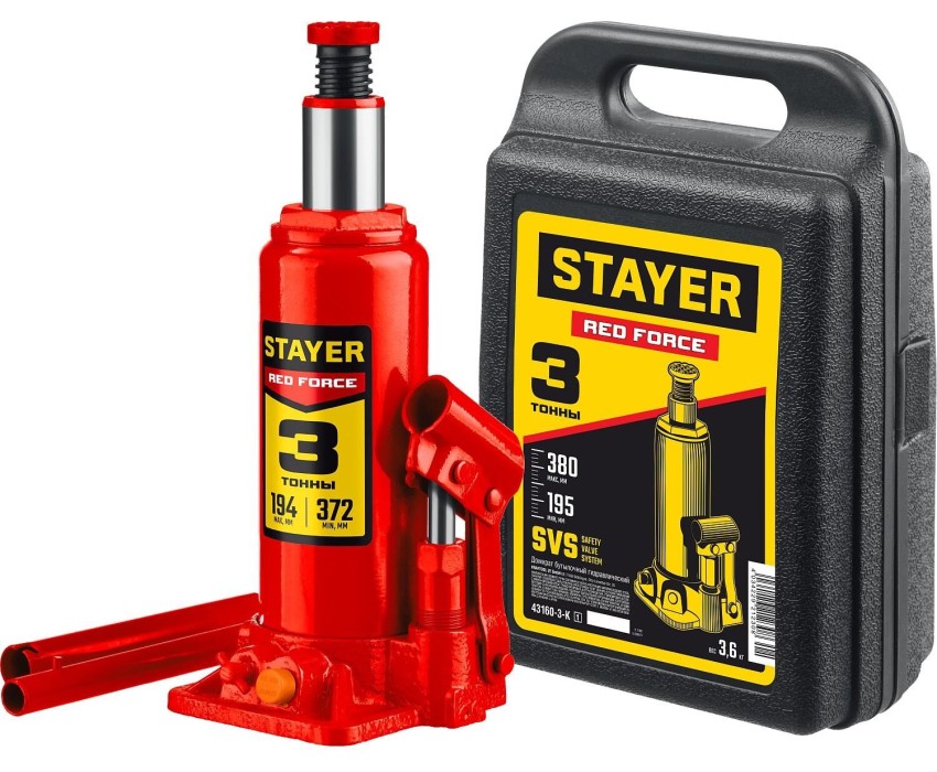 STAYER RED FORCE, в кейсе, 3 т, 194 - 375 мм, бутылочный гидравлический домкрат, Professional (43160-3-K)