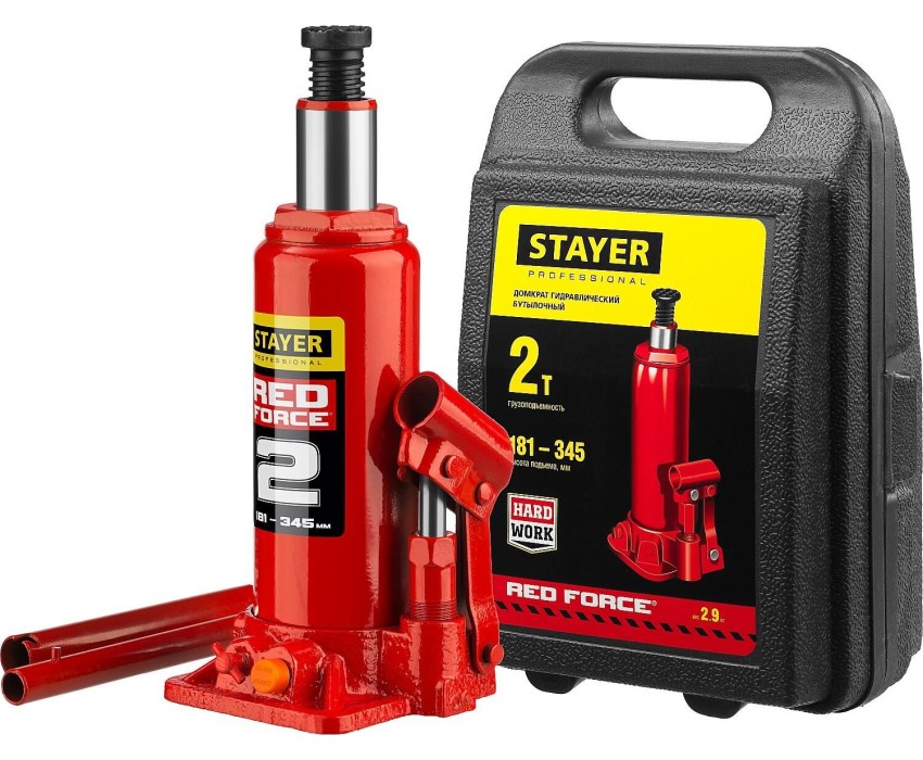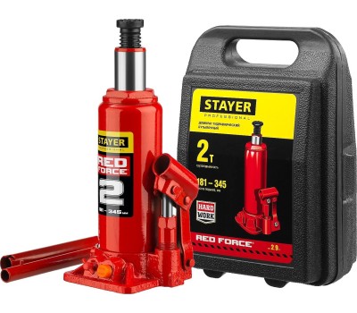 STAYER RED FORCE, в кейсе, 2 т, 181 - 345 мм, бутылочный гидравлический домкрат, Professional (43160-2-K)