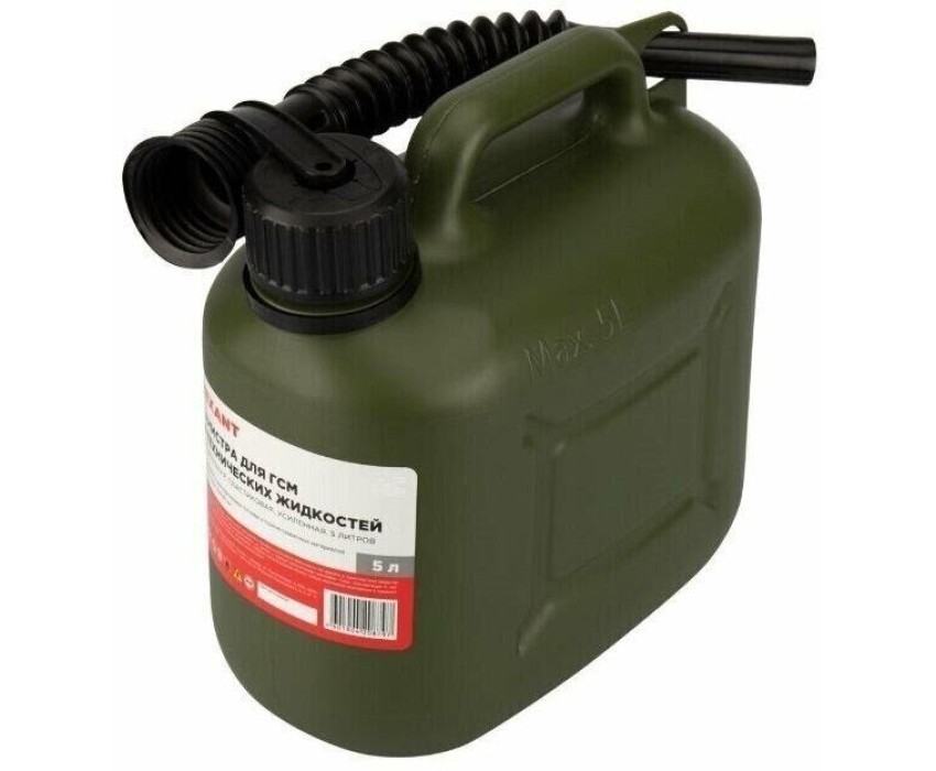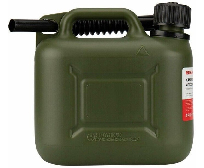 Вертикальная усиленная канистра REXANT объемом 5 л предназначена для хранения и транспортировки топлива и горюче-смазочных материалов. Изготовлена из высококачественного прочного (первичного в производстве) полиэтилена (ПЭНД). Имеет международный сертификат соответствия перевозки легковоспламеняющихся грузов, наличие которого дает возможность заправлять канистру на любых АЗС, находящихся на территории РФ и ЕС. Изделие имеет: боковые ребра жесткости, утолщенные стенки (которые позволяют выдержать высокие нагрузки при экстремальных условиях эксплуатации), зеленый цвет изделия, широкую уздечку держания заливного шланга (которая не прокручивается вместе с крышкой и не ломается на морозе), выемку на дне изделия для руки, эргономичную широкую ручку, усиленный шов на дне, детскую защиту на крышке, широкую горловину для залива и заправки, гофрированный гибкий шланг с системой «антибульк», маслобензостойкий уплотнитель на крышке, антистатические присадки, дополнительную ручную обработку швов и горловины.