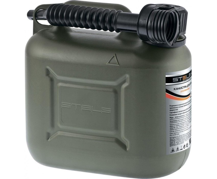 Усиленная пластиковая канистра Stels 53124 объемом 5 л, вертикальная, используется для транспортировки топлива и других ГСМ, а также их хранения в гараже или на даче. Будет полезна для дозаправки автомобиля в дороге. Также пригодится для обслуживания бензотехники: пил, триммеров, газонокосилок и другого оборудования.ПреимуществаДолгий срок службы — канистра усиленной конструкции изготовлена из маслобензостойкого пластика увеличенной толщины.Комфортное использование — специальный носик позволяет переливать бензин без риска испачкаться.Компактность — канистру удобно перевозить в багажнике легкового автомобиля.
