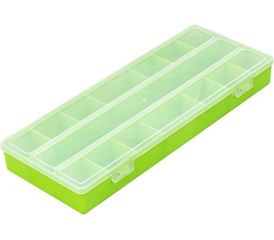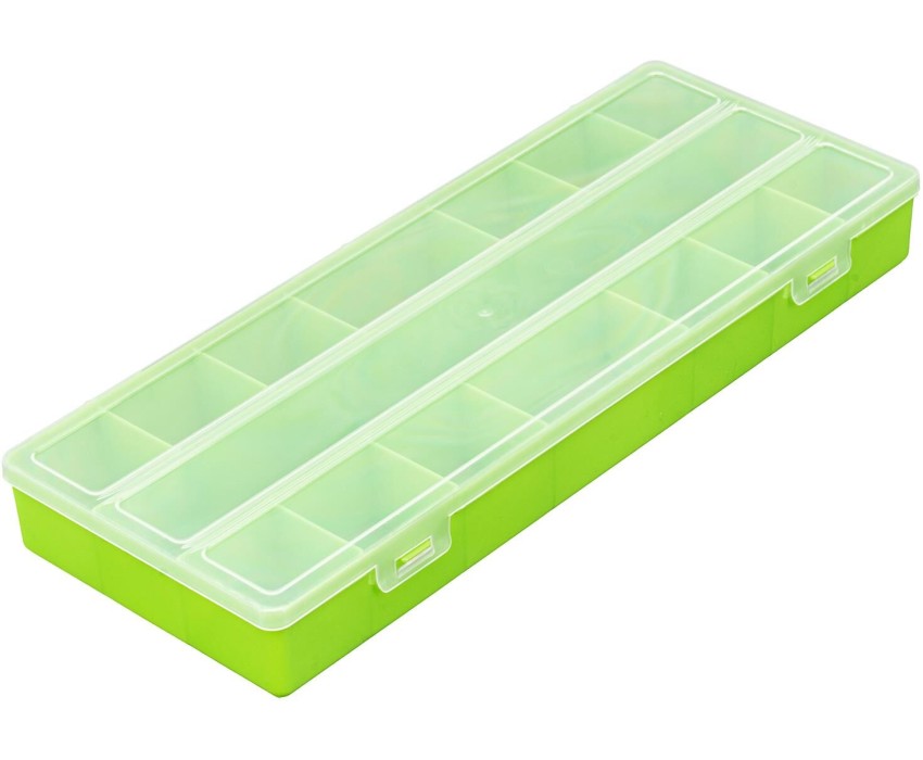 Универсальный бокс Сибртех 90732 размером 382 х 152 х 45 мм используется для хранения и транспортировки мелочей. В него можно положить украшения, снасти, крепежные элементы, канцтовары и др. Контейнер позволит сэкономить пространство, а также упорядочить вещи для более удобного поиска. За счет компактных размеров блок легко поместится в ящике с инструментами, комоде или на столе. Преимущества Полипропиленовый бокс надежно защищает содержимое от пыли и брызг воды. Бокс оснащен 15 большими и маленькими секциями для хранения вещей разного размера и формы. Благодаря прозрачной крышке содержимое блока можно увидеть без ее открытия.