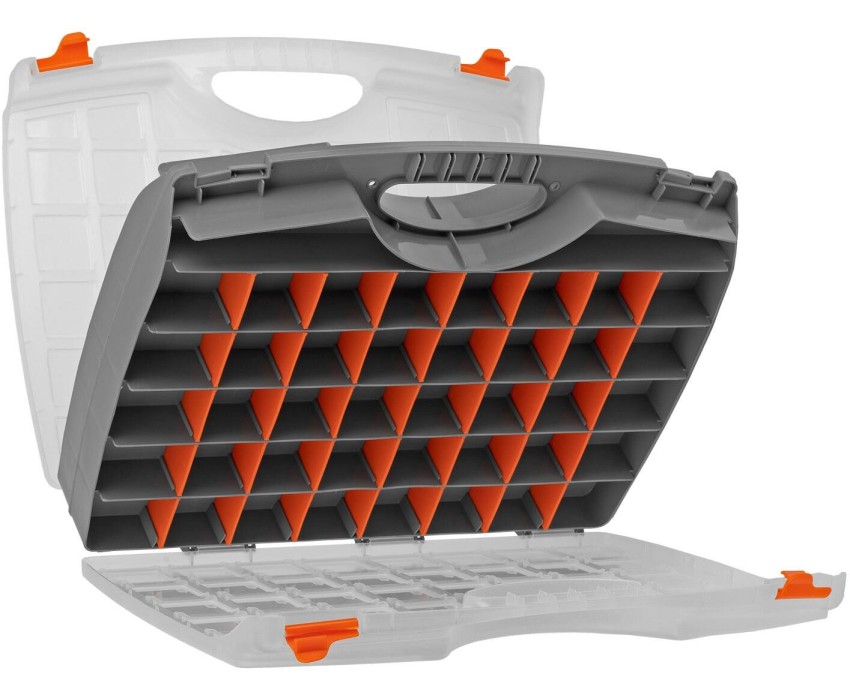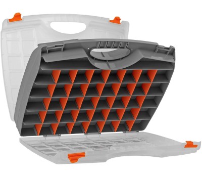 Двухсторонний органайзер из пластика Stels 90710 размером 425 х 330 х 85 мм пригодится в хозяйстве и мастерской для хранения крепежных элементов, принадлежностей для рукоделия, снастей и т.д. Он обеспечивает быстрый доступ к предметам, не допуская их перемешивания и утери. Преимущества Корпус из высококачественного полипропилена гарантирует сохранность вещей, т.к. не допускает попадания влаги и пыли. Секции можно регулировать по размеру, это позволяет организовать места хранения в зависимости от потребностей владельца. Органайзер имеет 84 секции, поэтому вмещает большое количество деталей. Защелки и ручка обеспечивают удобство транспортировки органайзера.