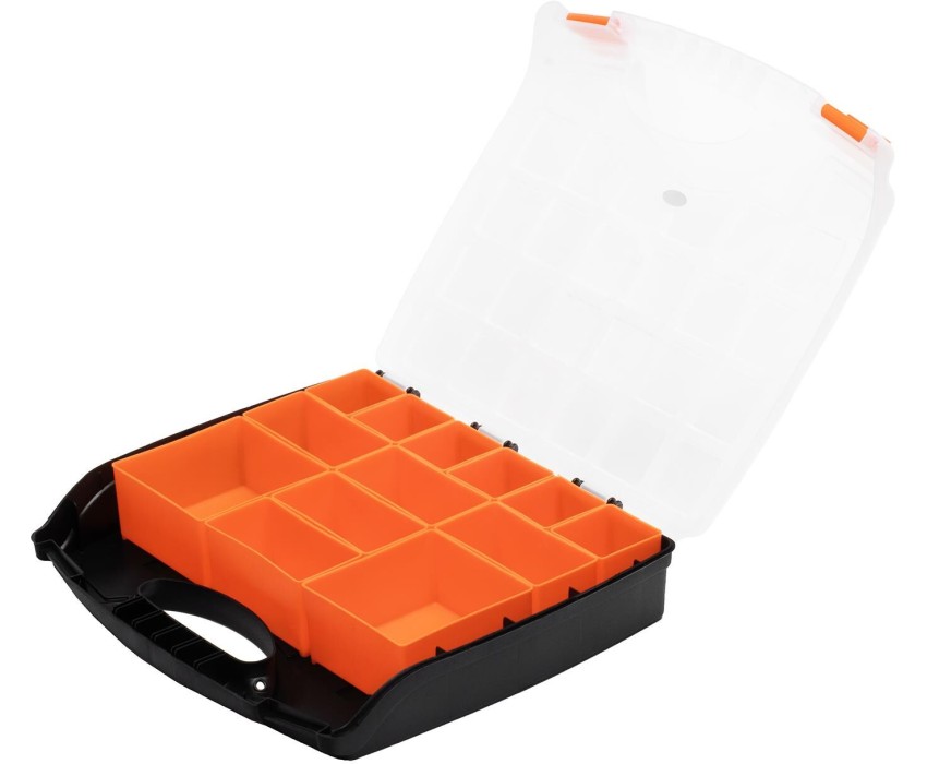 Органайзер с контейнерами Stels 90724 размером 325 х 280 х 60 мм, из пластика, пригодится в хозяйстве и мастерской для хранения крепежных элементов, принадлежностей для рукоделия, снастей и т.д. Он обеспечивает быстрый доступ к предметам, не допуская их перемешивания и утери. Преимущества Корпус из высококачественного полипропилена гарантирует сохранность вещей, т.к. не допускает попадания влаги и пыли. Контейнеры можно доставать и переставлять для удобства хранения различных по размерам предметов, а также для размещения под рукой деталей на рабочем месте. Органайзер имеет 13 секций, поэтому вмещает большое количество деталей. Защелки и ручка обеспечивают удобство транспортировки органайзера.
