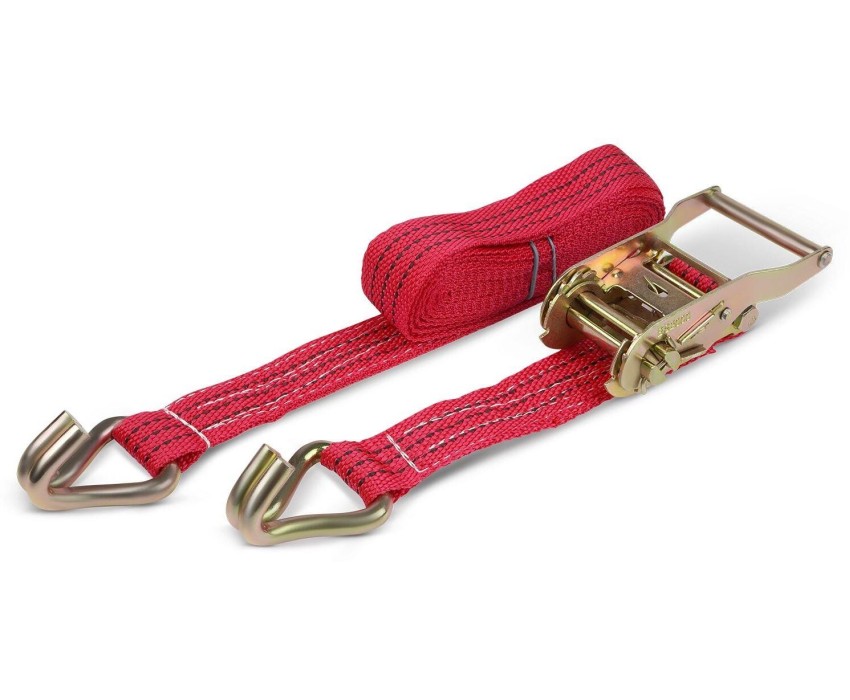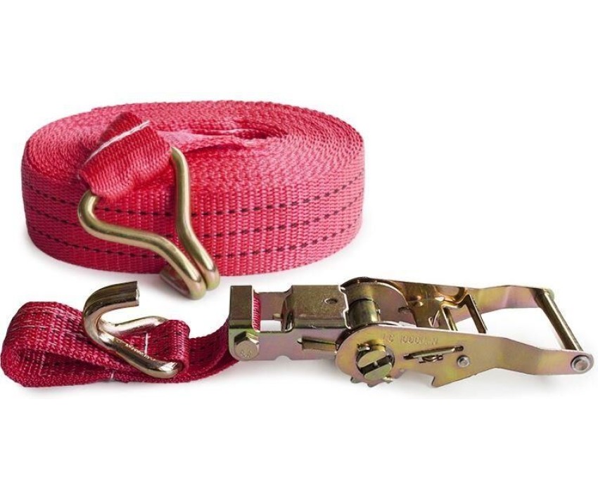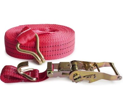 Выдерживает нагрузку на прямое стяжное усилие – 1 тонну и стяжное усилие при обхвате – 2 тонны. Характеристики • Храповый стяжной механизм из стали с ручкой типа «Эконом» (ручка полностью стальная, не имеет вставок). • Высокопрочная лента из полипропилена 35 мм. Имеет прочные швы. Отличается морозостойкостью и устойчивостью к агрессивным средам. Длина ленты составляет 6 метров. • J – образные стальные крюки.