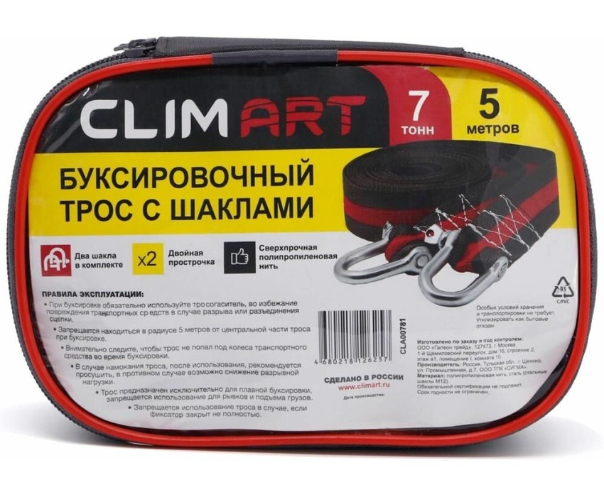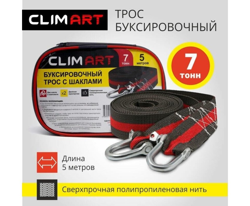 Трос буксировочный CLIM ART Трос буксировочный с шаклами CA 7т, 5м в сумке