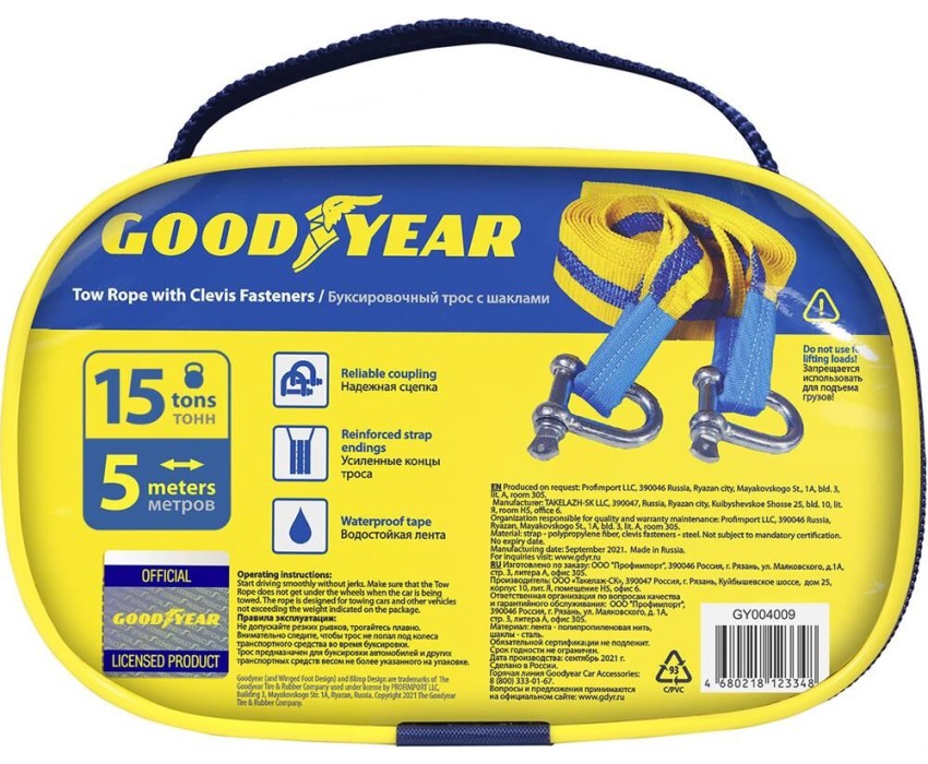 Буксировочный трос Goodyear предназначен для буксировки автомобиля общей массой до 15 тонн. Незаменим в условиях бездорожья и в аварийных ситуациях.