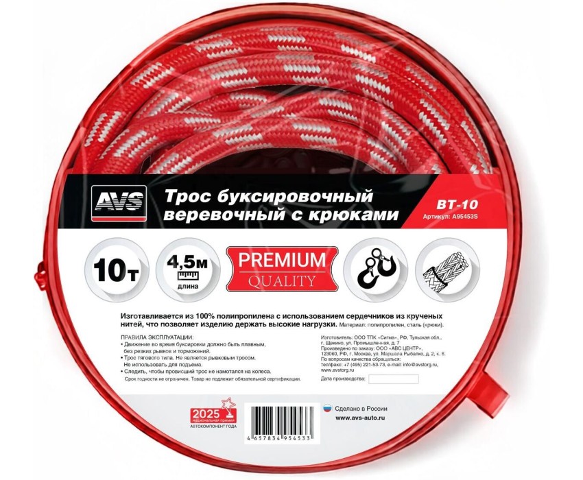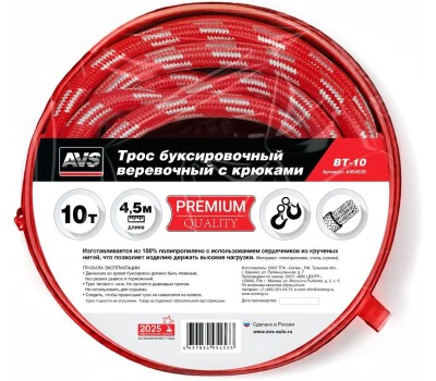 Трос буксировочный AVS Трос буксировочный веревочный с крюками 10т 4,5м BT-10 в сумке