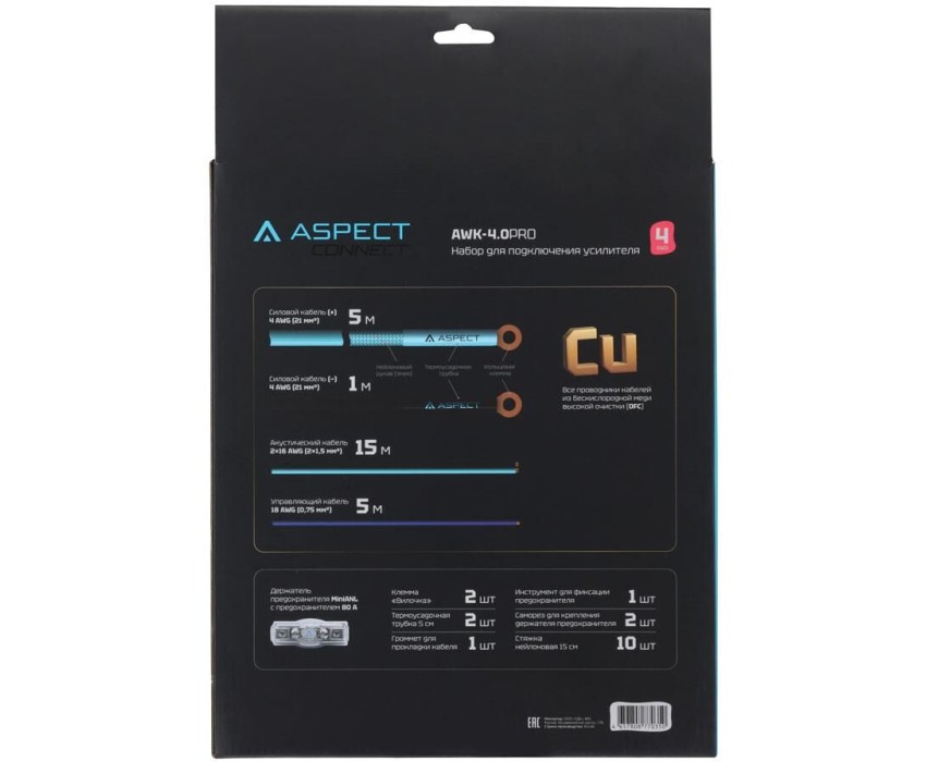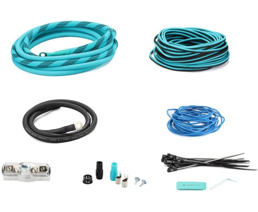 Рекомендуемая мощность усилителя до 1200 Вт Силовой кабель плюсовой 4 AWG (21 мм2) ультраэластичная изоляция цвета циан в полиэстеровом рукаве (1,5 метра), обжат клеммой "кольцо" Ø 8мм, медные проводники (OFC) - 5 метров Силовой кабель минусовой 4 AWG (21 мм2) ультраэластичная изоляция черного цвета, обжат клеммой "кольцо" Ø 8 мм, медные проводники (OFC) - 1 метр Акустический кабель 16 AWG (1,5 мм2) ультраэластичная черная-циан изоляция, медные проводники (OFC) - 15 метров Управляющий кабель (remote) 18 AWG (0,75 мм2) синяя изоляция, медные проводники (OFC) - 5 метров Держатель предохранителя miniANL Латунь, покрытие никель, предохранитель miniANL 80 А в комплекте - 1 шт. Клемма силовая «вилка» 4 AWG, латунь, покрытие никель, черная - 1 шт., циан - 1 шт. Термоусадка для силового кабеля Для кабеля 4 AWG - 2 шт., циан Громмет (монтажная пластиковая втулка) Для кабеля 4 AWG - 1 шт. Саморез для монтажа держателя предохранителя 4,2 х 13 мм - 2 шт. Ключ шестигранный M3*20 х 50 мм - 1 шт. Стя