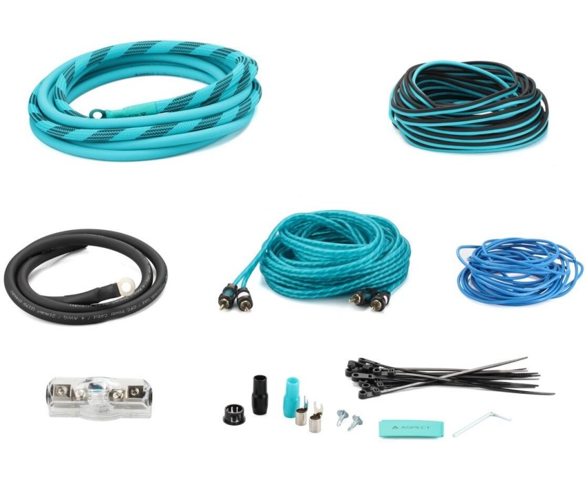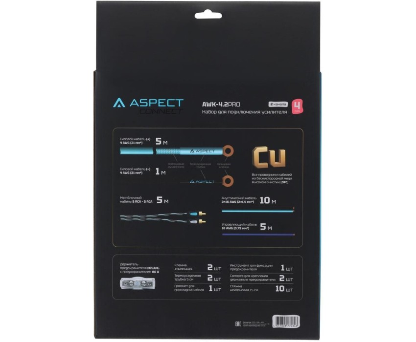 Рекомендуемая мощность усилителя до 1200 Вт Количество каналов усилителя 2 канала Силовой кабель плюсовой 4 AWG (21 мм2) ультраэластичная изоляция цвета циан в полиэстеровом рукаве (1,5 метра), обжат клеммой "кольцо" Ø 8мм, медные проводники (OFC) - 5 метров Силовой кабель минусовой 4 AWG (21 мм2) ультраэластичная изоляция черного цвета, обжат клеммой "кольцо" Ø 8 мм, медные проводники (OFC) - 1 метр Акустический кабель 16 AWG (1,5 мм2) ультраэластичная черная-циан изоляция, медные проводники (OFC) - 10 метров Межблочный кабель RCA 2RCA - 2RCA витая пара, экран, медные проводники (OFC) - 5 метров (RCA-CL2.5) Управляющий кабель (remote) 18 AWG (0,75 мм2) синяя изоляция, медные проводники (OFC) - 5 метров Держатель предохранителя miniANL Латунь, покрытие никель, предохранитель miniANL 80 А в комплекте - 1 шт. Клемма силовая «вилка» 4 AWG, латунь, покрытие никель, черная - 1 шт., циан - 1 шт. Термоусадка для силового кабеля Для кабеля 4 AWG - 2 шт., циан
