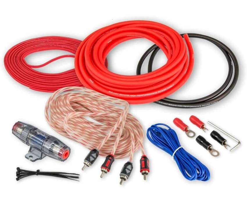 Комплект для подключения 2-х канального усилителя Силовой кабель 8AWG (8мм2) красный — 5 метров Проводник: CCA (омедненный алюминий) Силовой кабель 8AWG (8мм2) черный — 1 метр Проводник: CCA (омедненный алюминий) Колба MiniANL + предохранитель 40A RCA-кабель: 5 метров, 2 канала, витая пара (RCA-A150 MkII). Акустический кабель 16AWG (2×1,5мм2) — 10 метров Провод «remote» 18AWG (0,75мм2) синий — 5 метров Клемма кольцевая для силового кабеля сечением 8AWG (8мм2): 2 шт. Клемма U-образная для силового кабеля сечением 8AWG (8мм2): 2 шт. Шестигранник Стяжки - 10шт.
