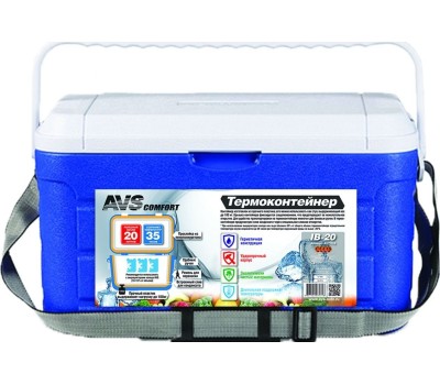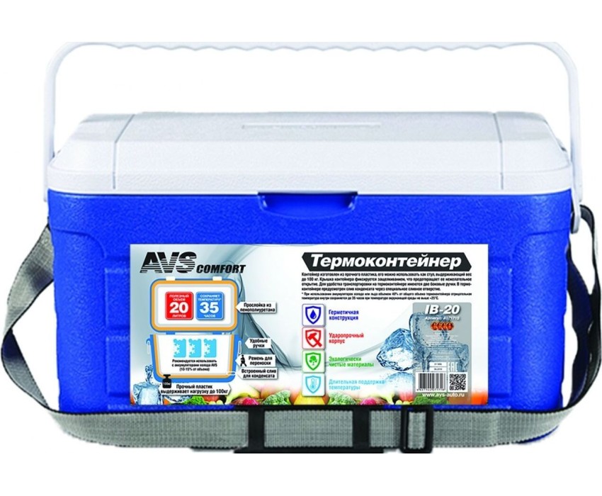 Контейнер изготовлен из прочного пластика, его можно использовать как стул, выдерживающий вес до 100 кг. Для удобства транспортировки помимо ручки присутствует ремень. При использовании аккумуляторов холода или льда объемом 40% от общего объема термоконтейнера отрицательная температура внутри сохраняется до 35 часов при температуре окружающей среды не выше +25°С. Характеристики •Объем: 20 литров •Размер внешний (см): 28(Г)*51(Ш)*28,2(В) •Размер внутренний (см): 21,3(Г)*44,6(Ш)*22(В) •Вес: 2,1 кг •Герметичная конструкция •Ударопрочный корпус •Экологически чистые материалы •Длительная поддержка температуры •Прочный пластик выдерживает нагрузку до 100кг •Прослойка из пенополиуретана •Рекомендуется использовать с аккумуляторами холода AVS (10-15% от объема) Материал: пластик, пенополиуретан Комплектация: Термоконтейнер Инструкция Ремень для переноски Состав: Пластик, пенополиуретан