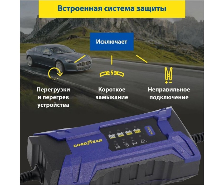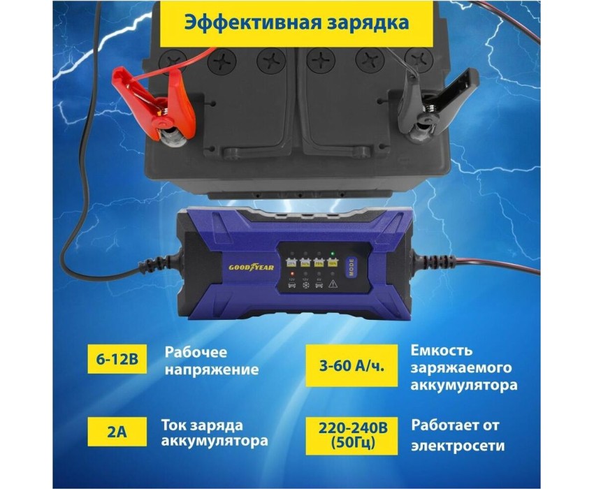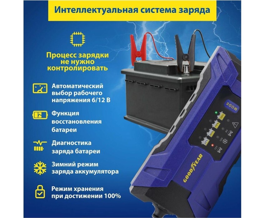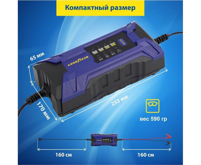 Электронное зарядное устройство Goodyear для свинцово-кислотных аккумуляторов CH-2A Электронное зарядное устройство Goodyear Smart предназначено для аккумулятора модели CH-2A. Применяется для заряда всех типов автомобильных аккумуляторов WET, MF, GEL, AGM. Особенности: - интеллектуальная система заряда, - светодиодная индикация, - зимний режим заряда аккумулятора, - индикация степени заряда аккумулятора, - усиленные зажимы, - автоматический выбор рабочего напряжения 6/12 В, - встроенная система защиты от переплюсовки, короткого замыкания и перегрева устройства, - заряд всех типов аккумуляторов (WET, MF, GEL, AGM). Технические характеристики: Заряд аккумуляторов: 6-12В. Емкость заряжаемого аккумулятора: 3-60 А/ч. Ток заряда аккумулятора: 2А. Напряжение электросети: 220-240В (50Гц). Комплектация: зарядное устройство с проводами прикуривания и усиленными зажимами, инструкция по эксплуатации, гарантийный талон.