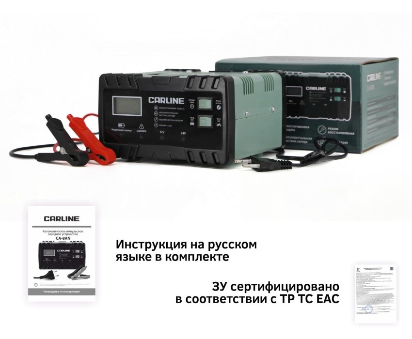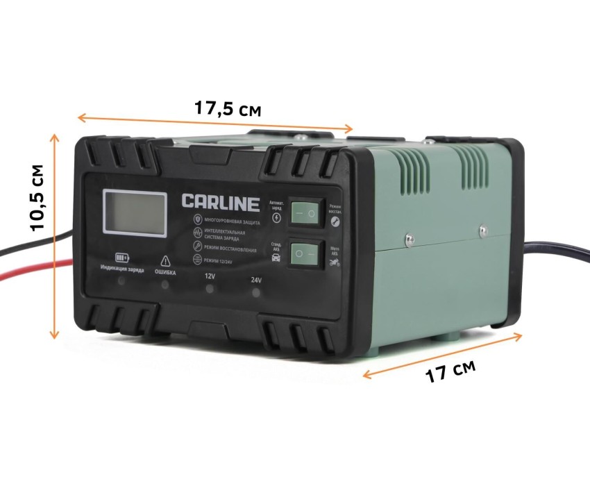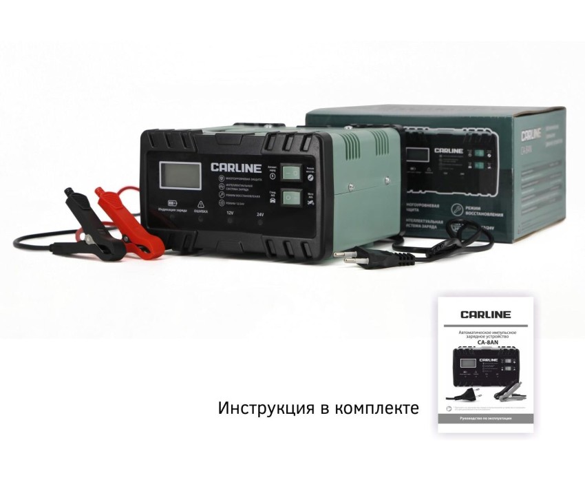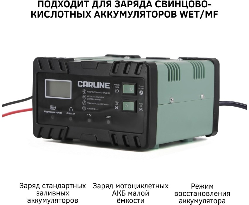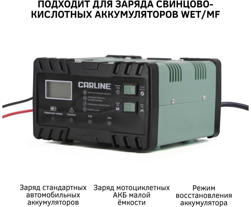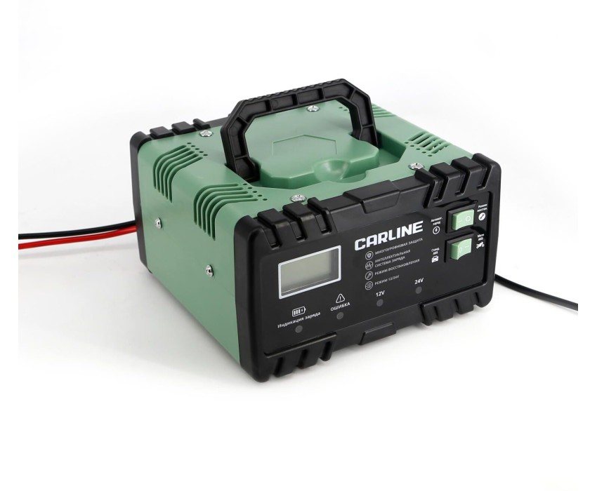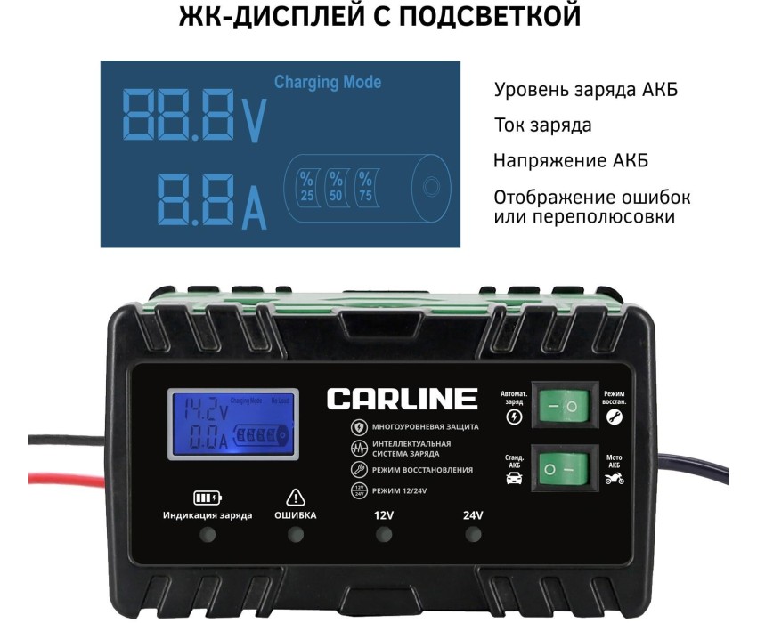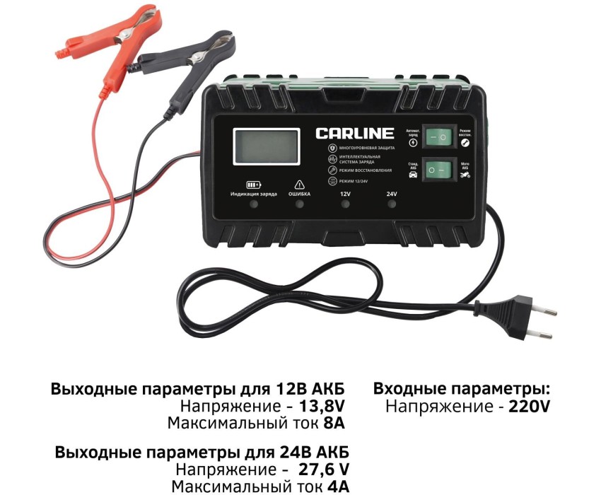 Особенности (УТП) • Режим восстановления сильно разряженных АКБ • Режим заряда аккумуляторов малой емкости • Многоуровневая защита • Заряд всех типов свинцово-кислотных аккумуляторов (WET, MF) • ЖК-дисплей с подсветкой • Отображение уровня заряда АКБ Комплектация: • Зарядное устройство с зажимами типа «крокодил» • Инструкция по эксплуатации • Гарантийный талон Технические характеристики: • Входные параметры: 220 V • Выходные параметры для 12 V: 13.8 V – 8 A • Выходные параметры для 24 V: 27.6 V – 4 A • Заряд аккумуляторов: 12/24 V • 3 режима: стандартный АКБ, мотоциклетный АКБ малой емкости, режим восстановления АКБ • Отображение информации на дисплее: уровень заряда АКБ, напряжение АКБ, ток заряда, отображение ошибок или переполюсовки • Цвет корпуса: зелено-черный