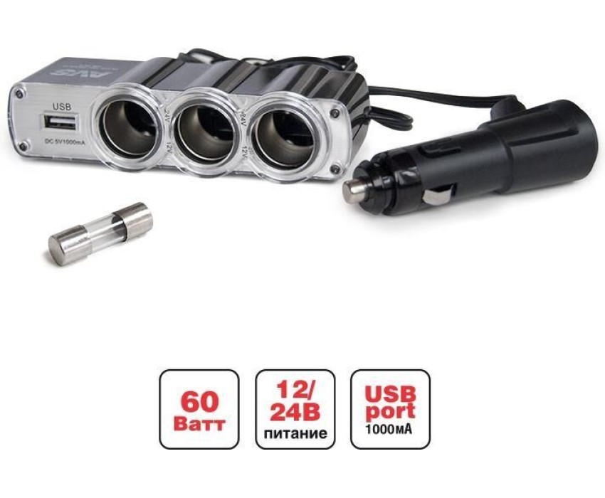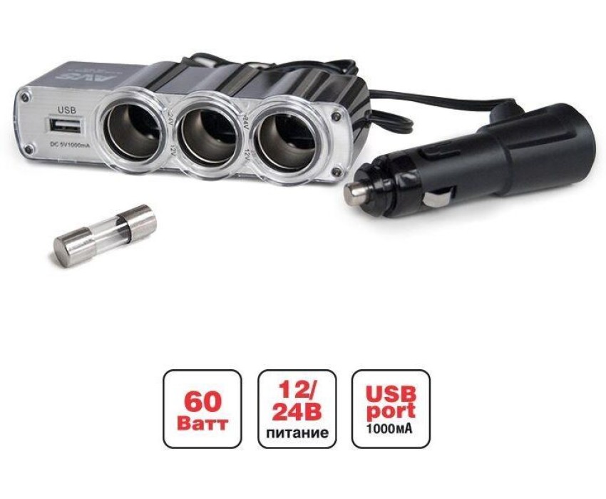 Разветвитель позволяет подключать до 4-х устройств одновременно в разъем прикуривателя через 3 собственных разъема прикуривателя и USB порт. Крепкое надежное устройство в корпусе из огнестойкого пластика. Защита от короткого замыкания и перепадов напряжения. Возможность установки в любой части автомобиля, благодаря проводу длиной 1 метр. Работа в сетях с номинальным напряжением 12В и 24В. Универсален для любых автомобилей. Характеристики •Питание: 12/24 В •Мощность: 60 Вт •Максимальный выходной ток: 5 А •Защита от короткого замыкания •Количество гнезд: 3 •USB порт: 1 •Выходной ток USB порта: 1000 мА •Длина провода: 1 м •Светодиодный индикатор сети •Плавкий предохранитель в корпусе штекера Материал: пластик Комплектация •Разветвитель •Предохранитель