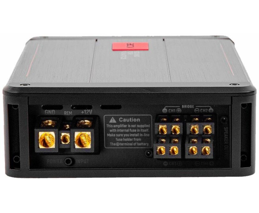 Номинальная мощность 4 Ом: СТЕРЕО 350Вт х 4, MOHO в мостовом включении: 1000Вт х 2 Номинальная мощность 2 Ом: СТЕРЕО 500Вт х 4 Чувствительность: 200мВ – 8В Отношение сигнал/шум: >91 дБ Коэффициент гармонических искажений: (THD) @ 1 кГц (4 Ом) 0,05% Особенности модели Класс усилителя: D Стабильная работа на нагрузке: 2 и 4 Ом Bass Boost: 0~12дБ Диапазон частот: 10 Гц ~ 50 кГц Общие характеристики Размеры: 314x145x52 мм Питание Рабочее напряжение: 10-15В пост. ток Разделение каналов Разделение каналов: >60 дБ Low pass фильтр: 10Гц ~ 8кГц High pass фильтр: 10Гц ~ 8кГц Число каналов: 4/3/2