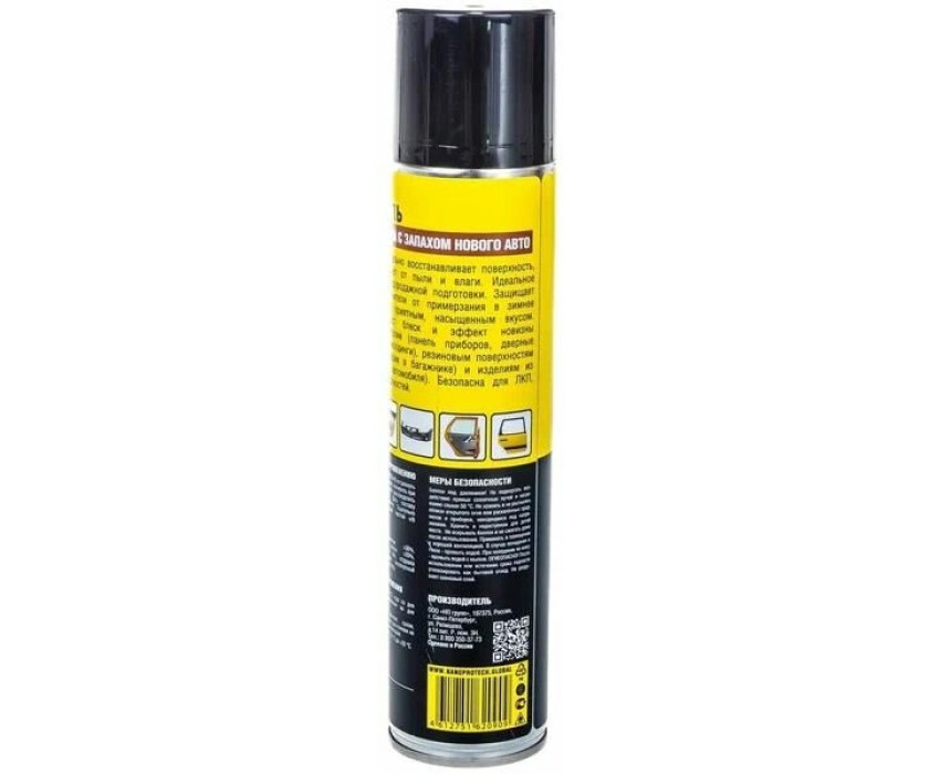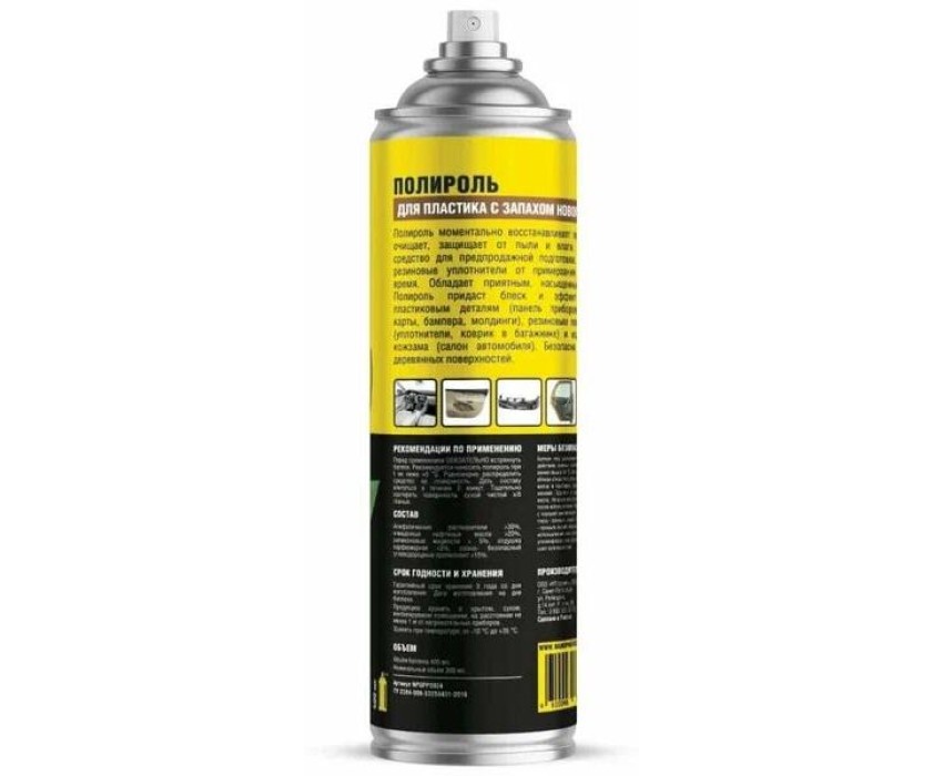 Придает поверхностям блеск и эффект новизны. Создает защитную пленку, которая защищает поверхность пластика от грязи и пыли, а также от воздействия ультрафиолетового излучения. Способствует удалению загрязнений и обладает антистатическим эффектом. Не оставляет следов и разводов на обработанной поверхности. Придает обработанной поверхности приятный запах Нового автомобиля.
