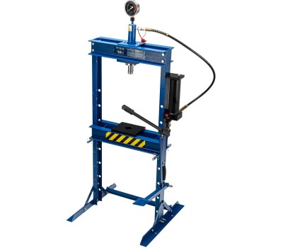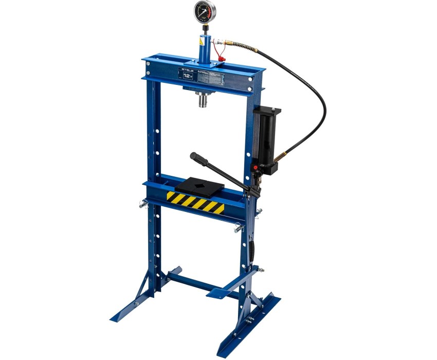 Гидравлический пресс Stels 52312 с манометром и педалью способен воздействовать на предметы с усилием до 12 т. Его используют для монтажа и демонтажа различных деталей — подшипников, сайлентблоков, втулок, штифтов, рычагов. Шток имеет исключительно плавный ход благодаря высокому уровню исполнения гидравлического насоса и самого штока. Для нагнетания давления можно использовать как ручной, так и ножной привод, что облегчает работу и упрощает контроль за процессом прессования. Пресс пригодится для ремонта автомобилей — самостоятельного или в автосервисе. Преимущества Надежная конструкция — все элементы выполнены из прочного металла, качество сварных швов свидетельствует о соблюдении всех технологических требований в процессе производства. Защита от перегрузок — в случае превышения максимально допустимого давления срабатывает предохранительный перепускной клапан. Устойчивость к образованию коррозии — поверхность штока хромирована. Удобный контроль прикладываемого усилия — пресс оснащен глицеринозаполненным манометром. Работа с предметами разных габаритов — высота подъема рабочего стола регулируется. Точное позиционирование штока — цилиндр передвигается в горизонтальной плоскости. Комфортная работа — шток автоматически возвращается в исходное положение. Разборная конструкция — пресс удобен в хранении и транспортировке. Гарантированное качество — пресс изготовлен с использованием новейших технологий, а все его узлы прошли контрольные испытания.