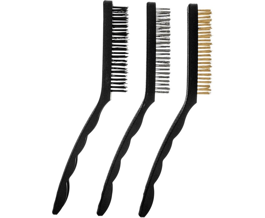 Набор из 3 больших щеток Matrix 74863 с пластмассовыми ручками предназначен для различных видов обработки — стальные удаляют ржавчину, загрязнения и старую краску с металлических и других поверхностей, а нейлоновая браширует и мягко очищает деревянные изделия. Набор пригодится во время ремонта, проведения кузовных работ, а также будет полезен в быту. Преимущества Высокий ресурс — витая стальная проволока устойчива к деформации, латунированное покрытие защищает щетину от коррозии. Надежность — проволока прочно закреплена в основании и не выпадает во время работы, пластиковые корпусы не рассыхаются и служат долго. Комфортная работа — эргономичные рукоятки удобно ложатся в руку. Продуманная упаковка — набор поставляется в блистере с подвесом, удобном для размещения на стенде.