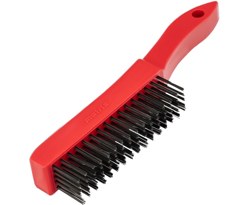 Зачистная пятирядная щетка Matrix 74815 с пластиковой ручкой и щетиной из закаленной прямой проволоки используется для удаления загрязнений, ржавчины, остатков лакокрасочных покрытий с металлических, деревянных, бетонных поверхностей. Пучки расположены в 5 рядов, в каждом пучке 20 щетинок, поэтому щетка выдерживает повышенные нагрузки. Щетка пригодится во время проведения строительных и ремонтных работ, а также будет полезна дома или в гараже. Преимущества Прочность и износостойкость — щетина выполнена из закаленной высокоуглеродистой стали. Долговечность — масляная пленка защищает проволоку от коррозии, рукоятка из прочного пластика не подвержена рассыханию. Надежная фиксация пучков ворса в основании — проволока не выпадает во время работы. Комфортная работа — изогнутая рукоятка удобно ложится в руку. Удобное хранение — в рукоятке имеется отверстие для подвешивания щетки.