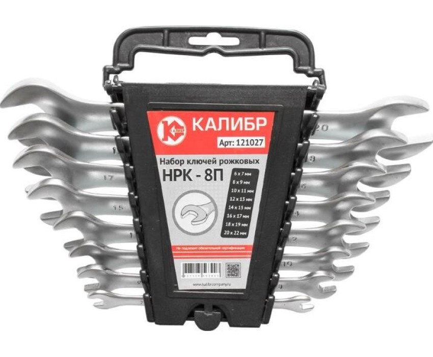 Набор рожковых ключей Калибр НРК-8П, арт.121027 состоит из 6 предметов. Каждый ключ изготовлен из высокопрочной CrV стали. Для удобства хранения набор комплектуется пластиковым подвесом. Рожковые ключи Калибр предназначены для работы с крепежом. Ключи: 6х7, 8х9, 10х11, 12х13, 14х15, 16х17, 18х19, 20х22 мм