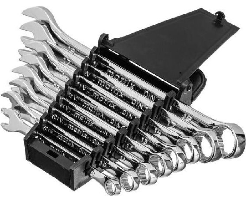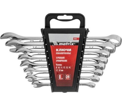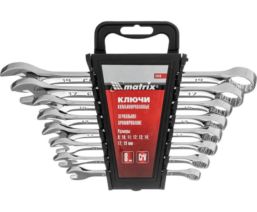Набор Matrix 15418 включает 8 комбинированных ключей из стали CrV, размером 8-19 мм, с покрытием «полированный хром», которые пригодятся во время ремонтных работ дома или в гараже. С их помощью можно быстро монтировать и демонтировать крепежные элементы. В набор входят инструменты основных типоразмеров, позволяющие эффективно решать поставленные задачи.ПреимуществаВысокая деформационная стойкость — ключи изготовлены из хромованадиевой стали, а рабочие части закалены до твердости 45 HRC.Защита от разрушения — полированное хромоникелевое покрытие предотвращает образование коррозии.Аккуратная работа — накидные части с 12-гранным профилем охватывают всю поверхность крепежа, уменьшая риск деформации его граней.Комфортная работа в ограниченном пространстве — угол наклона кольцевых зевов относительно плоскости инструментов составляет 15°, что делает монтаж крепежа более удобным.Удобный пластиковый держатель — ключи не потеряются во время хранения и транспортировки.