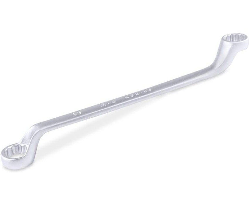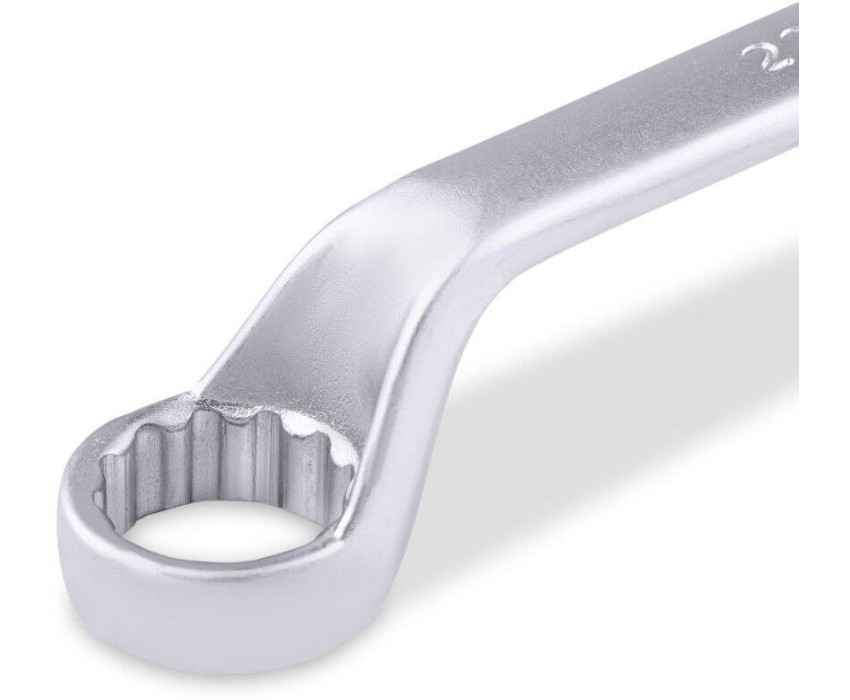 Накидной ключ – это рукоять и зажимная часть, которая охватывает весь периметр гайки. Он более удобен в эксплуатации и надежнее фиксирует крепеж, чем рожковый. Применяется для работ с высоконагруженными резьбовыми соединениями. Изогнутая на 75° коленчатая рабочая часть облегчает доступ в труднодоступные места. Кольцевые ключи имеют 12 граней. 12-тигранный ключ более распространен в использовании (поворот на 30 градусов). Из-за большого пятна контакта вероятность деформации углов сведена к нулю. Ключи изготавливаются из легированной хромованадиевой стали по стандарту DIN 838, в соответствии с ГОСТ 2906-80. Размер ключа: 21 мм, 23 мм Длина ключа: 299,00 мм Покрытие: сатиновое ГОСТ 2906-80 Прочность: 47-52 HRC DIN-838