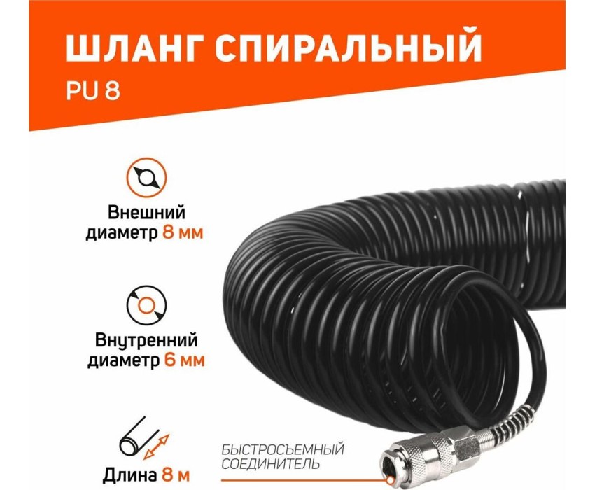 Шланг спиральный PATRIOT PU 8, Максимальное давление: 10 бар; Диаметр внешний: 8 мм; Диаметр внутренний: 6 мм; Длина: 8 м; Соединение: быстросъем; Материал: Полиуритан.
