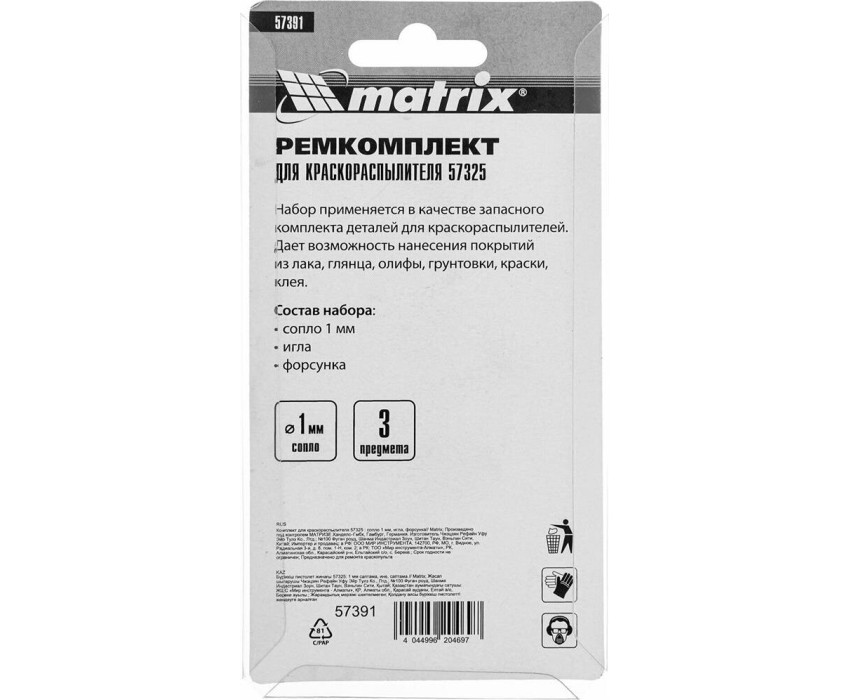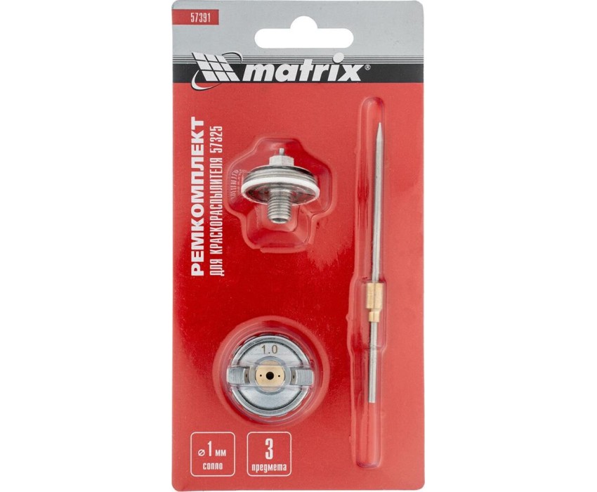Комплект Matrix 57391 для краскораспылителя Matrix 57325 включает в себя 3 предмета: сопло диаметром 1 мм, иглу и форсунку. Их можно использовать для ремонта инструмента или расширения его функциональных возможностей.ПреимуществаВсе предметы изготовлены из высококачественной стали и латуни, поэтому устойчивы к механическим повреждениям.Сопло диаметром 1 мм подходит для распыления жидких составов: лаков, олифы, грунтовки, клея и красок, в том числе глянцевых.Форсунка обеспечивает нанесение покрытия по технологии HVLP (высокий объем, низкое давление), уменьшая потери краски.Игла мгновенно открывает и закрывает сопло, позволяя точно контролировать подачу лакокрасочного материала.