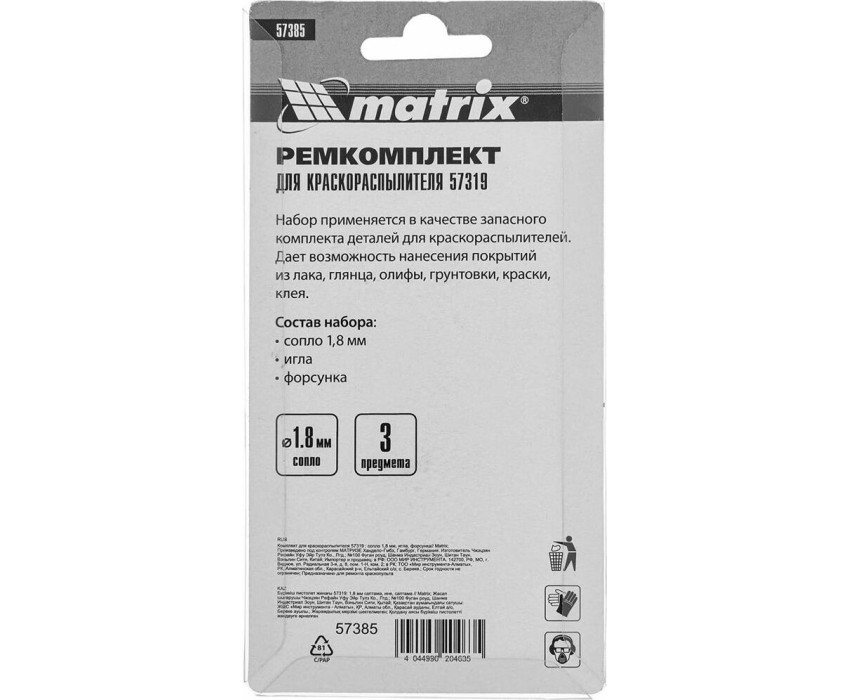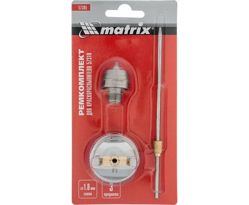 Комплект Matrix 57385 для краскораспылителя Matrix 57319 включает в себя 3 предмета: сопло диаметром 1,8 мм, иглу и форсунку. Их можно использовать для ремонта инструмента или расширения его функциональных возможностей.ПреимуществаВсе предметы изготовлены из высококачественной стали и латуни, поэтому устойчивы к механическим повреждениям.Сопло диаметром 1,8 мм подходит для распыления лаков, олифы, грунтовки, клея и красок, в том числе глянцевых.Форсунка обеспечивает нанесение покрытия по технологии HVLP (High Volume Low Pressure, высокий объем, низкое давление), уменьшая потери краски.Игла мгновенно открывает и закрывает сопло, позволяя точно контролировать подачу лакокрасочного материала.