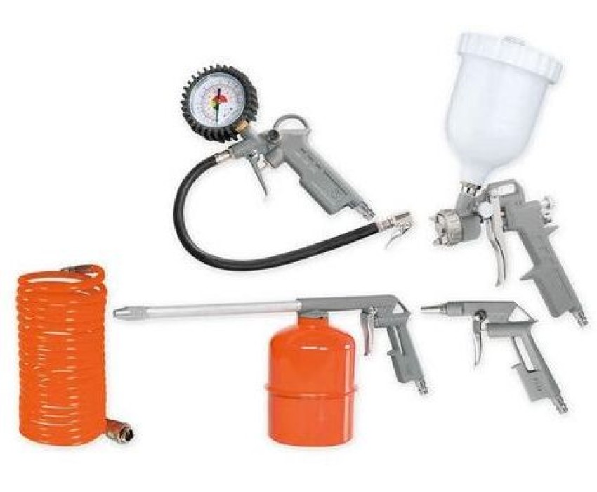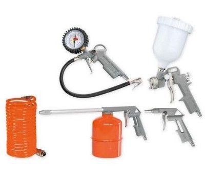 Комплектация: Насадка для работы со сжатым воздухом, насадка для распыления краски, насадка для распыления жидкости, насадка для подкачки шин, воздушный шланг (4 метра), упаковка.. Особенности: Инструменты имеют большой рабочий ресурс и возможность длительной работы без остановки. Пистолет для подкачки шин оснащен большим манометром для точного контроля за уровнем давления внутри шин. Спиральный пневмошланг длиной обеспечивает стабильную работу инструмента.. Вес нетто: 2.5. Расход воздуха: 450. Поставляется в: коробка. Габариты упаковки (ед) ДхШхВ: 0.405x0.12x0.22. Вес упаковки (ед): 1.92. Гарантия: 12 мес.. Давление: 12 Бар. Цвет: оранжевый. Количество предметов в наборе: 5 предметов. Давление: 12 Бар. Расход воздуха: 450 л/мин. Количество предметов в наборе: 5 предметов