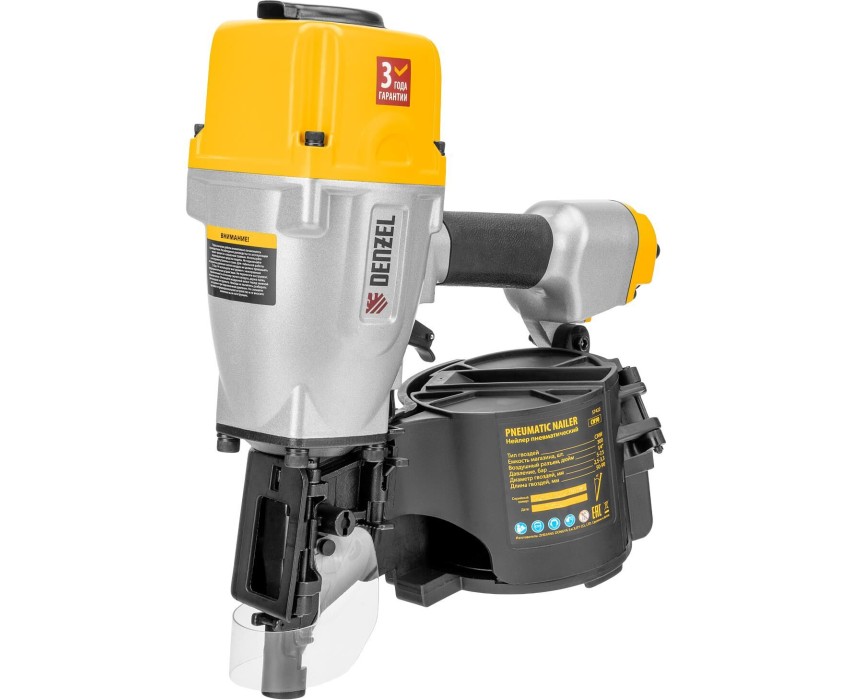 Пневматический нейлер Denzel CN90 57422 совместим с барабанными гвоздями типа CNW длиной 50-90 мм и предназначен для проведения строительно-ремонтных работ, а также производства мебели, паллет и других изделий из дерева, таких как тара и упаковка. Максимальное рабочее давление составляет 7,5 бар, что обеспечивает высокую скорость работы и позволяет быстро и эффективно решать поставленные задачи. Преимущества Долговечность — алюминиевый корпус устойчив к механическим воздействиям и коррозии. Эргономичность — обрезиненная рукоятка удобно ложится в руку и не выскальзывает из ладони, что обеспечивает комфорт при длительной работе. Быстрая загрузка барабанных гвоздей — нейлер позволяет эффективно выполнять работы по креплению различных материалов. Готовность к эксплуатации — в комплект поставки входит масленка и шестигранные ключи для настройки и обслуживания. Бесперебойная работа — магазин вмещает 300 гвоздей, что позволяет длительное время не отвлекаться на загрузку крепежа. Безопасность пользователя — экран защищает от вылета инородных частиц, а блокировка выключателя предотвращает случайное срабатывание механизма. Небольшой вес — инструмент можно удерживать одной рукой, что особенно удобно при работе на вертикальных поверхностях. Гарантия 3 года — надежность пневматического нейлера подтверждена производителем.