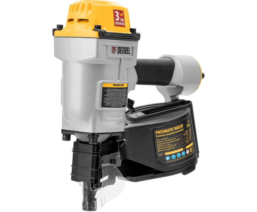 Пневматический нейлер Denzel CN70 57421 совместим с барабанными гвоздями типа CNW длиной 45-70 мм и предназначен для проведения строительно-ремонтных работ, а также производства мебели, паллет и других изделий из дерева, таких как тара и упаковка. Максимальное рабочее давление составляет 7,5 бар, что обеспечивает высокую скорость работы и позволяет быстро и эффективно решать поставленные задачи. Преимущества Долговечность — алюминиевый корпус устойчив к механическим воздействиям и коррозии. Эргономичность — обрезиненная рукоятка удобно ложится в руку и не выскальзывает из ладони, что обеспечивает комфорт при длительной работе. Быстрая загрузка барабанных гвоздей — нейлер позволяет эффективно выполнять работы по креплению различных материалов. Готовность к эксплуатации — в комплект поставки входит масленка и шестигранные ключи для настройки и обслуживания. Бесперебойная работа — магазин вмещает до 300 гвоздей, что позволяет длительное время не отвлекаться на загрузку крепежа. Безопасность пользователя — экран защищает от вылета инородных частиц, а блокировка выключателя предотвращает случайное срабатывание механизма. Небольшой вес — инструмент можно удерживать одной рукой, что особенно удобно при работе на вертикальных поверхностях. Гарантия 3 года — надежность пневматического нейлера подтверждена производителем.