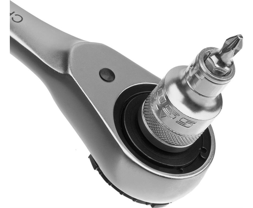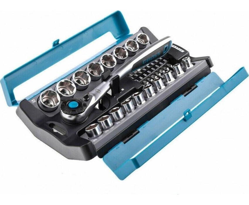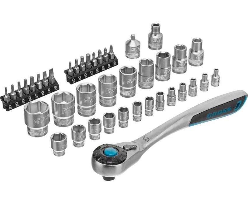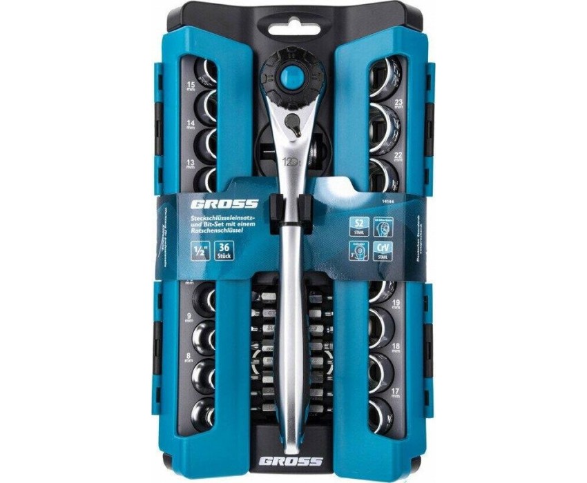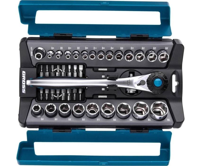 Наборы инструмента GROSS разработаны специально для автолюбителей и центров технического обслуживания. Головки и комбинированные ключи изготовлены из хромованадиевой стали, придающей инструменту исключительную твердость в сочетании с легкостью. Биты, биты-вставки и отвертки производятся из стали S2, улучшающей свойства инструмента. Набор комплектуется трещотками с реверсом и быстрым сбросом, трещоточный механизм имеет 120 зуба и обеспечивает исключительную мягкость и плавность в работе. Шаг зуба 3 град. Все наборы упакованы в кейс. Наборы инструмента GROSS пригодятся вам не только в автомобиле. С их помощью можно проводить бытовой ремонт дома и на даче, ремонт бытовых конструкций и садовой техники. Набор предназначен для слесарно-монтажных работ. Состав набора:Ключ трещоточный 1/2" Переходник 1/2" – 1/4" Адаптер для бит 5/16" - 1/2" Головки торцевые 1/4": 4, 4,5, 5, 5,5, 6, 7, 8, 9, 10, 11, 12, 13, 14 мм Головки торцевые 1/2": 10, 12, 14, 15, 17, 18, 19, 22, 24 мм, Биты 5/16": PH1, PH2