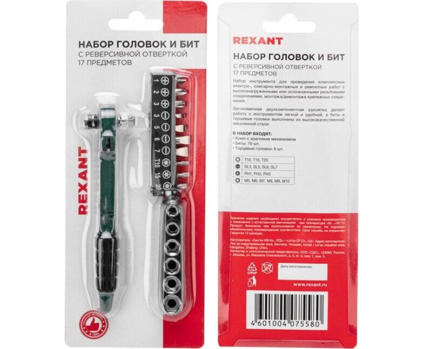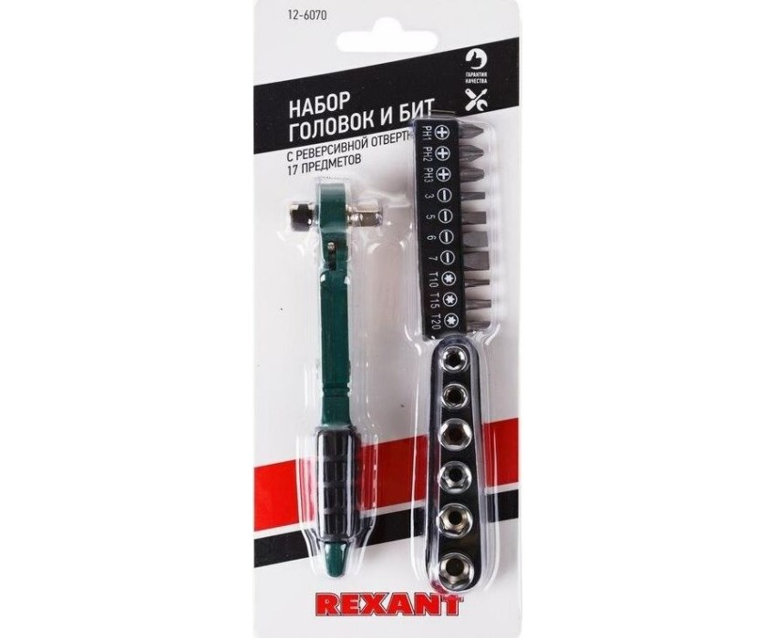Наборы головок торцевых и насадок со вставками REXANT (12-6070) НАБОР ГОЛОВОК И БИТ С КЛЮЧОМ-ТРЕЩОТКОЙ 17 ПРЕДМЕТОВ