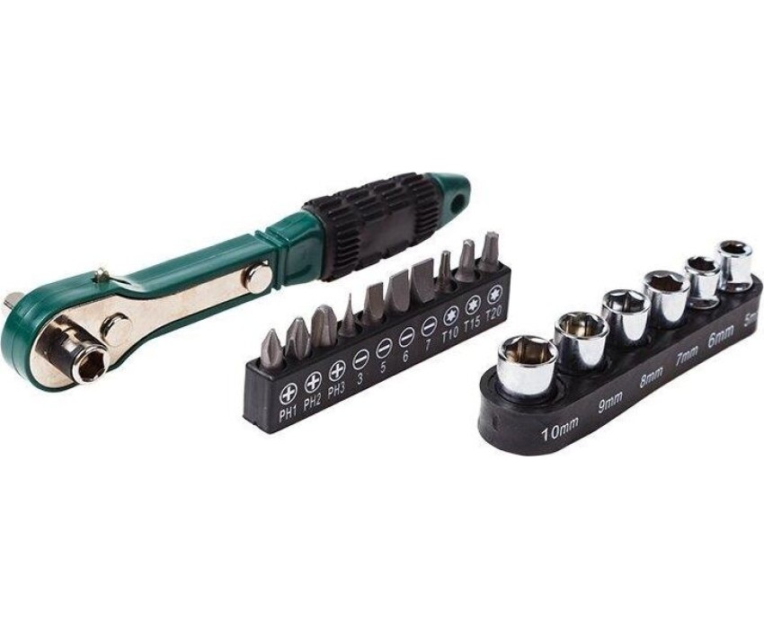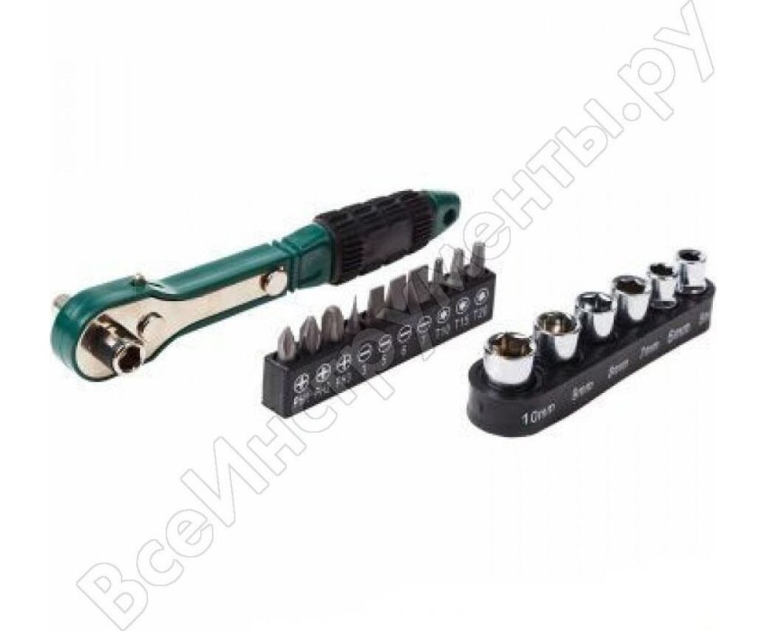 Характеристики: Биты: SL3, SL5, SL6, SL7, T10, T15, T20, PH1, PH2, PH3 Размеры торцевых головок: 5/6/7/8/9/10 мм Твердость материала рабочей части головок: 55-58 HRС Посадочное место для присоединительного квадрата: 1/4” Количество граней зева головок: 6 Количество предметов: 17 Марка стали: CrV Преимущества: Выполнены из прочных долговечных материалов Защитное покрытие против коррозии Плашки-держатели для хранения инструментов