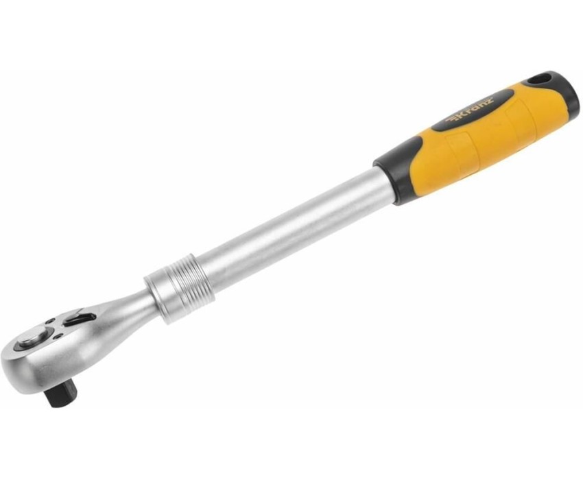 Телескопический хромированный трещоточный ключ KRANZ предназначен для монтажных работ с резьбовыми соединениями. Инструмент оснащен присоединительным квадратом размером 1/2 дюйма, что позволяет подключать различные насадки и головки в зависимости от потребности. Телескопическая рукоятка обеспечивает легкую регулировку длины в диапазоне от 330 до 460 мм, что делает ключ удобным для работы в разных условиях. Механизм фиксации гарантирует надежную блокировку рукоятки на требуемой длине. Двухкомпонентная рукоятка создает комфортное и надежное удержание в руке, что позволяет эффективно передавать усилие и контролировать инструмент во время работы. Изделие выполнено из высококачественной стали CrV. Хромированная отделка придает инструменту привлекательный внешний вид, а также защищает поверхность от коррозии и износа.