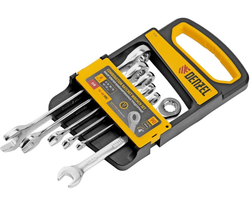 Набор комбинированных трещоточных ключей Denzel 14720 состоит из 6 инструментов из стали CrV. Используется для проведения монтажных и демонтажных работ с резьбовыми соединениями диаметром от 6 до 17 мм. У каждого ключа 2 рабочих профиля, что расширяет возможности использования набора. Инструменты пригодятся дома и в гараже. Преимущества Прочность и долговечность — ключи изготовлены из хромованадиевой стали, матовое хромовое покрытие защищает их от повреждений и коррозии. Износостойкость — твердость рабочих частей составляет 43-48 HRC, поэтому они не деформируются при работе со значительным усилием. Аккуратная работа — 12-гранная накидная часть увеличивает площадь соприкосновения с головкой крепежа и снижает риск ее деформации. Комфортная эксплуатация — храповой механизм с 90 зубьями обеспечивает максимально плавный ход, шаг трещотки составляет 4°.