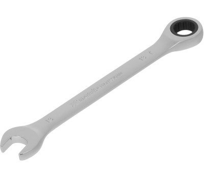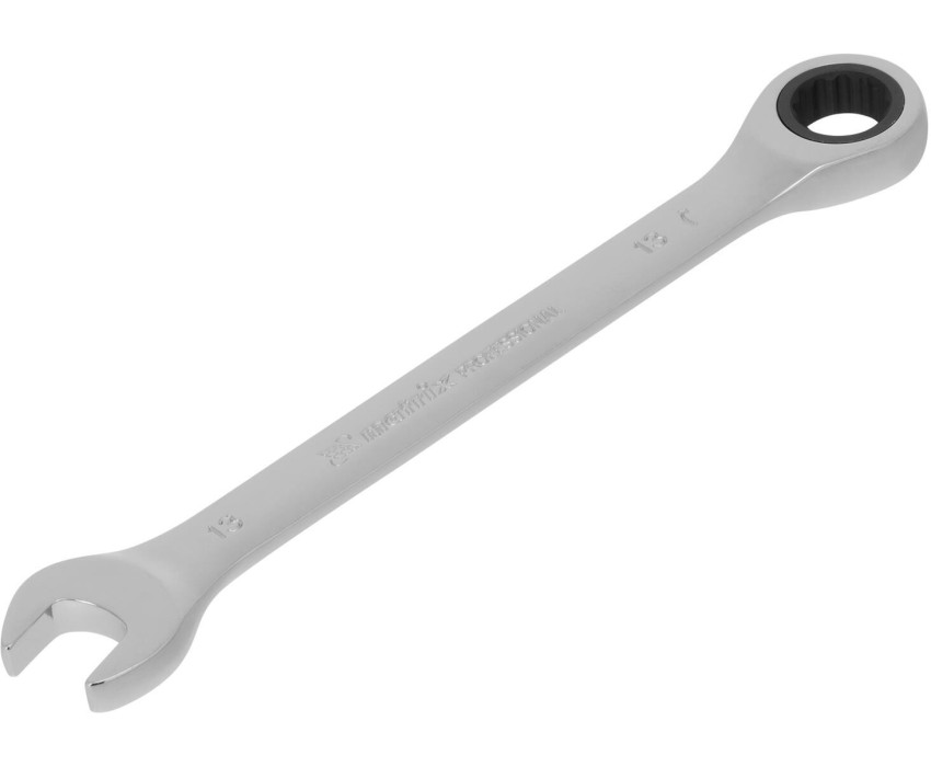 Комбинированный трещоточный ключ Matrix 14806 из стали CrV, с покрытием «зеркальный хром», размером 13 мм, позволяет быстро откручивать и закручивать болты и гайки. Рожковую часть удобно использовать там, где нет возможности полного охвата детали, а трещоточный механизм повышает удобство работы в труднодоступных местах. Преимущества Прочность — ключ из высококачественной стали 40CrV с храповым механизмом твердостью 58 HRC легко выдерживает интенсивные нагрузки. Коррозионная стойкость — зеркальное хромоникелевое покрытие защищает инструмент от воздействия влаги. Аккуратная работа — накидная часть с 12-гранным профилем полностью охватывает головку крепежа, что снижает риск деформации ее граней.